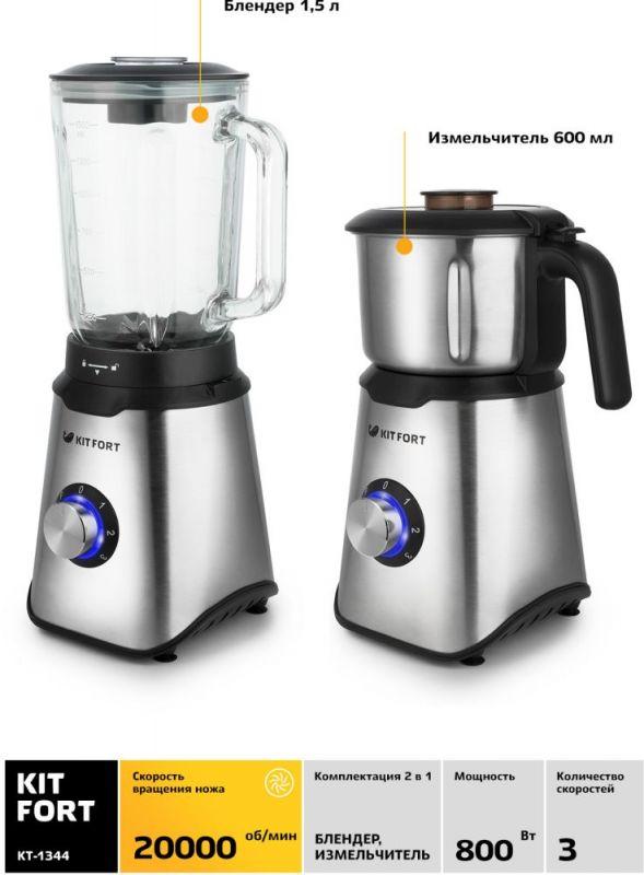 Блендер Kitfort КТ-1344 - это блендер и измельчитель. Благодаря надёжному двигателю, прибор справится со смешиванием коктейлей, взбиванием, измельчением, дроблением, с приготовлением фарша, колкой льда и помолом кофейных зёрен.Блендер с мощностью 800 Вт — это настоящий кухонный универсал, который справится с любыми задачами! Объемная чаша на 1,5 литра с мерной шкалой позволяет готовить большие порции, а удобное отверстие в крышке с колпачком дает возможность добавлять ингредиенты прямо во время работы. Прорезиненная крышка обеспечивает плотную фиксацию, предотвращая протечки, а защита от включения со снятой чашей делает использование блендера безопасным.