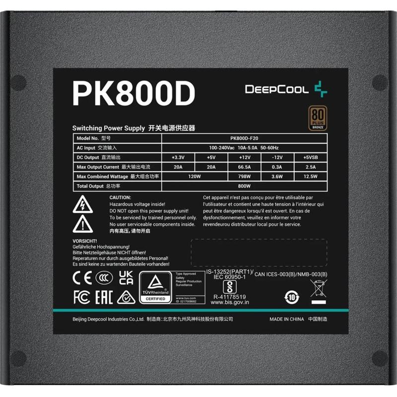Блок питания Deepcool R-PK800D-FA0B-WGEU 800 Вт Блок питания DEEPCOOL R-PK800D-FA0B-EU соответствует сертификации 80+ Bronze, что подтверждает высокий уровень энергоэффективности и производительности. Модель рассчитана на мощность 800 Вт и подходит для создания надёжной компьютерной системы для работы, игр или учебы. Высокопрочный корпус черного цвета устойчив к воздействию неблагоприятных факторов. Плоские кабели имеют оптимальную длину и облегчают укладку внутри системного блока. Блок питания DEEPCOOL PK800D R-PK800D-FA0B-EU оснащен активной системой вентиляции размером 120 мм, которая работает бесшумно и своевременно отводит тепло в зависимости от нагрузки. Благодаря преобразователю DC-DC, подача напряжения происходит более точно и изделие совместимо с комплектующими следующего поколения. Модель имеет высокую степень защиты от перебоев в сети и других неблагоприятных факторов. Внешний вид и/или характеристики товара могут быть изменены производителем в соответствии с производственным процессом.
