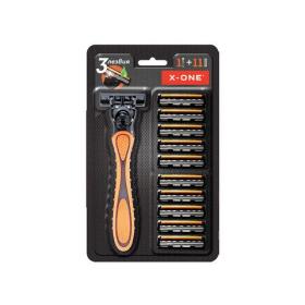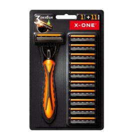 Бритва X-ONE с 11 сменными кассетами обеспечивает чистое бритьё и гладкость кожи. Система из 3 острых лезвий и увлажняющая полоска обеспечивают бережное бритьё и защиту от раздражений для комфортного использования.Бритвенный станок X-ONE с системой из 3 лезвий для максимально близкого бритья. Увлажняющая полоска защищает кожу, а противоскользящая ручка и эргономичный дизайн обеспечивают удобный и уверенный хват. В комплекте 11 сменных касет.