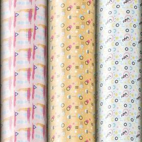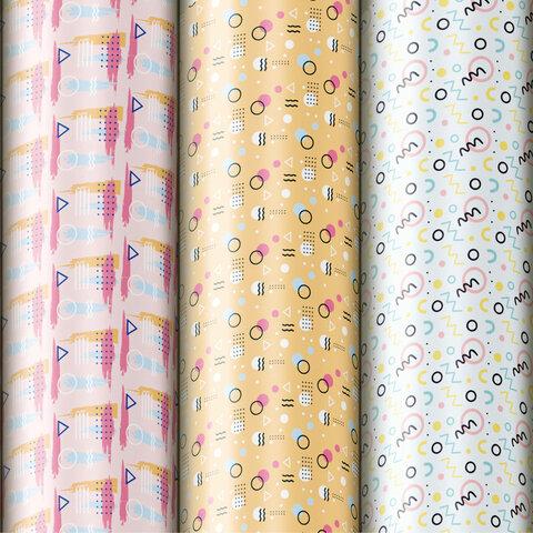 Набор упаковочной бумаги "Memphis" ЗОЛОТАЯ СКАЗКА отлично подходит для упаковки подарков, цветов, а также для рукоделия, декора и других дизайнерских решений.Упаковочная бумага – отличный способ придать особый статус подарку, а также ее можно использовать в творчестве для различных поделок, оригами, скрапбукинга. Набор из 3-х рулонов, каждый рулон – размером 70х100 см. Каждый из рулонов выполнен в универсальных дизайнах. Представляют собой мелованную бумагу. Итоговая плотность бумаги - 80 г/м2. Все три рулона свернуты в один и надежно упакованы в специальный картонный тубус, чтобы избежать всякого рода повреждений или замятий бумаги в процессе транспортировки.