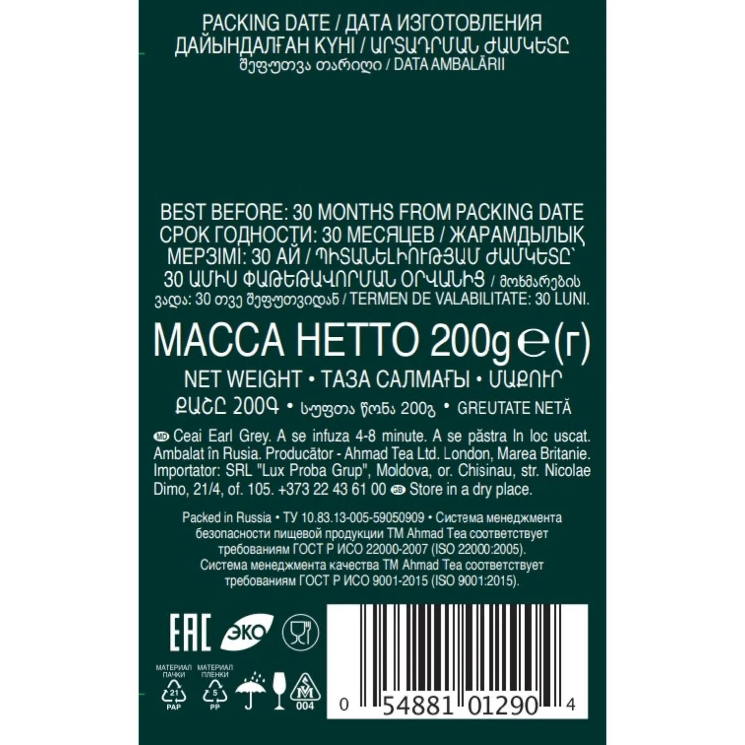 <br><br>Великолепный купаж чёрного чая высшего качества, сочетающий экзотические цитрусовые ноты и благородство цейлонского чая. Этот освежающий напиток любимый миллионами за неповторимый элегантный аромат бергамота. Удостоенный множества наград купаж Earl Grey — легенда компании Ahmad Tea.<br><b>Состав:</b> чай чёрный байховый среднелистовой, пищевой ароматизатор бергамот.<br><b>Способ приготовления:</b> 4-8 минут, температура воды 100 °С.<br><b>Вес:</b> 200 г.<br><b>Тип упаковки:</b> картонная коробка.<br><b>Условия хранения:</b> хранить в сухом помещении при относительной влажности воздуха не более 70%.<br><b>Страна производства:</b> Россия.