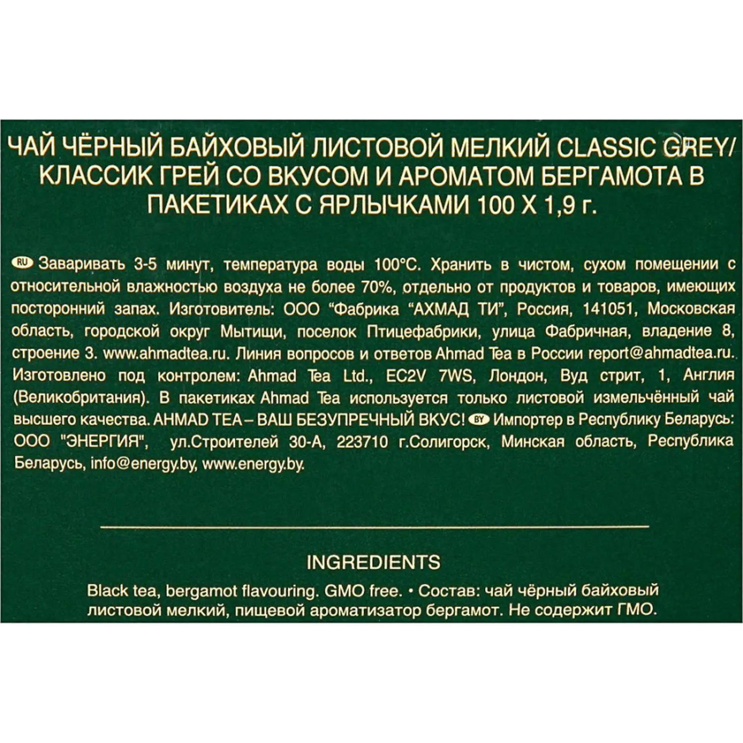 Чашка свежезаваренного чая Классик Грей — идеальное сочетание мягкого вкуса, аромата, цвета и крепости. Строгий классический вкус бергамота вносит завершающую ноту в звучание букета эксклюзивных сортов чёрного чая в совершенном исполнении Ahmad Tea. Прекрасный чай для любого времени дня.<br><b>Состав:</b> чай чёрный байховый листовой мелкий, пищевой ароматизатор бергамот.<br><b>Способ приготовления:</b> залить чай кипятком, дать чаю настояться 3-5 минут.<br>Количество пакетиков в упаковке: 100 штук.<br><b>Тип упаковки:</b> картонная коробка.<br><b>Условия хранения:</b> хранить в чистом, хорошо вентилируемом помещении без посторонних запахов при относительной влажности воздуха не более 70%.<br><b>Страна производства:</b> Россия.