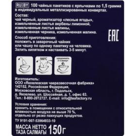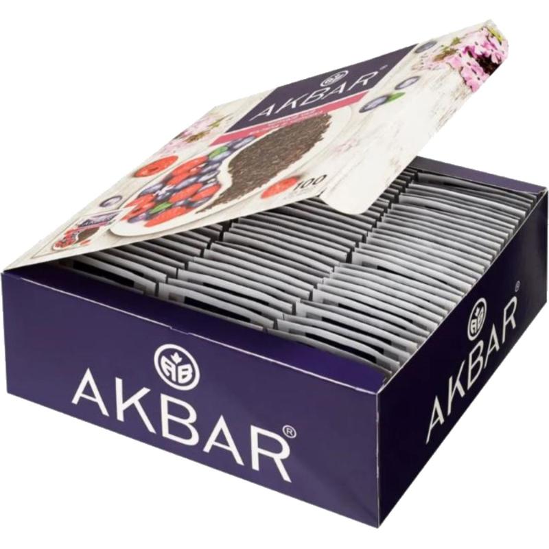 Чай чёрный Akbar Малина и Черника 100 пакетиков<br><br>Чай Akbar «Малина и Черника» чёрный ароматизированный в конвертах с измельчёнными натуральными компонентами. Без ГМО, без глютена, без злаков, без сахара.<br><b>Состав:</b> чай чёрный, ароматизатор «лесные ягоды», измельчённые листья вербены лимонной, измельчённый листья малины, измельчённая черника, измельчённая малина. <br><b>Способ приготовления:</b> положить в заварочный чайник или чашку по одному пакетику на человека. Залить кипятком и настаивать 3-5 минут.<br><b>Вес/количество пакетиков в упаковке:</b> 150 г, 100 штук.<br><b>Тип упаковки:</b> картонная коробка.<br><b>Условия хранения:</b> хранить в помещении с относительной влажностью воздуха не выше 70%, отдельно от резко пахнущих продуктов.<br><b>Страна производства:</b> Россия.