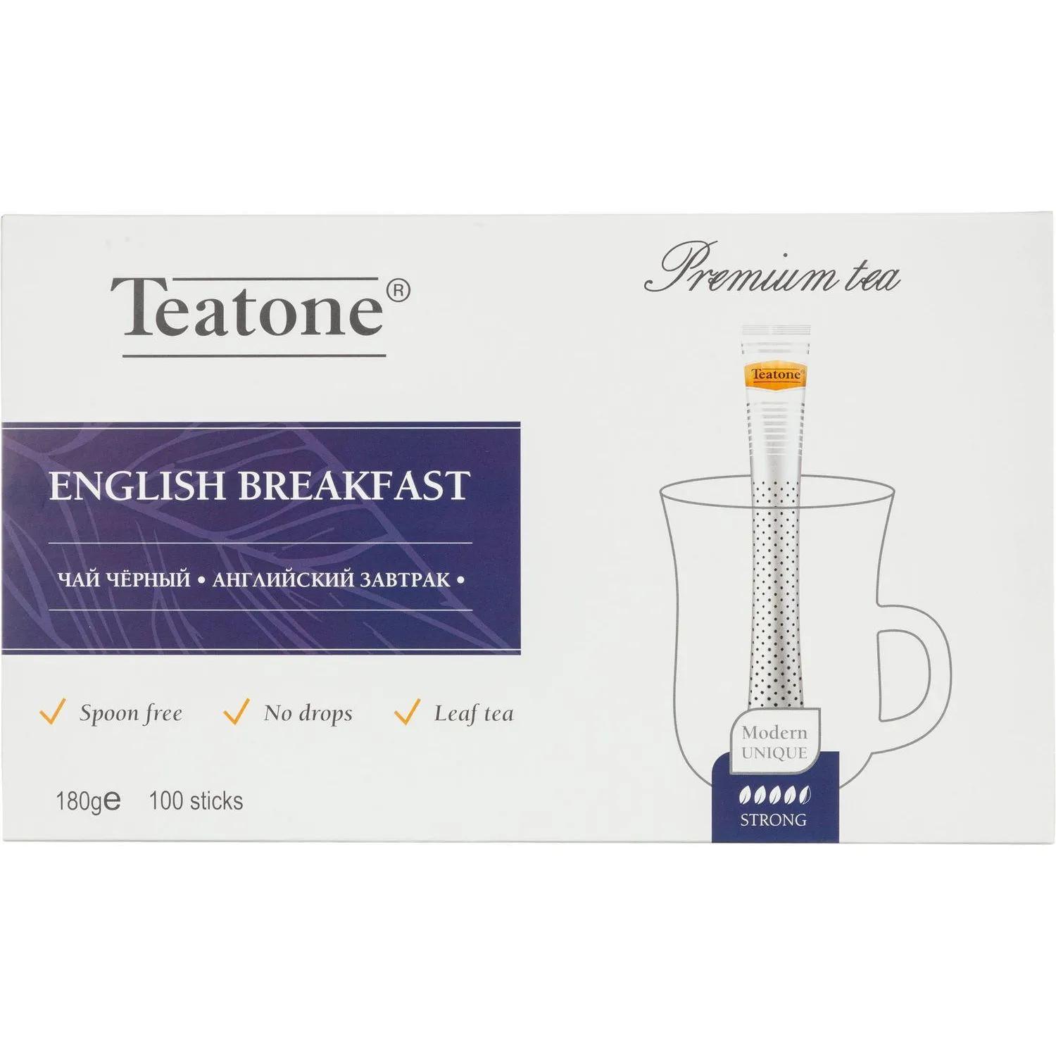 Чай чёрный Teatone English Breakfast 100 стиков. Чай чёрный «Английский Завтрак» с ароматом чайного листа «Teatone» в стиках для разовой заварки. Хорошая чашка чая — это лучший аккомпанемент для завтрака и начала нового дня. Яркий, насыщенный и бодрящий «Английский завтрак» идеально подходит как для оживления вашего дня, так и для захватывающего чаепития в любое время.<br><b>Состав:</b> чай чёрный листовой мелкий, ароматизатор «чайный лист» (содержит сахарный колер — d).<br><b>Способ приготовления:</b> залить стик кипятком, дать чаю настояться 3-5 минут.<br>Количество пакетиков в упаковке: 100 штук.<br><b>Тип упаковки:</b> картонная коробка.<br><b>Условия хранения:</b> хранить в чистом, хорошо вентилируемом помещении без посторонних запахов при относительной влажности воздуха не более 70%.<br><b>Страна производства:</b> Россия.