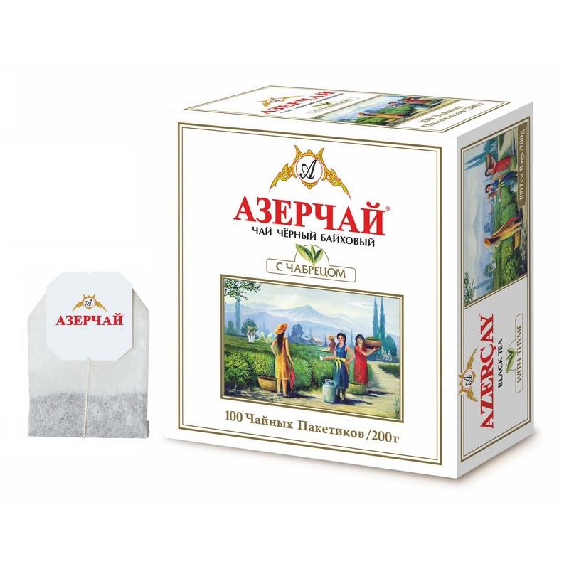 Чай черный Азерчай Букет 100 пакетиков (чабрец). Черный чай с чабрецом из Азербайджана представляет собой идеальное сочетание отборного черного чая и ароматного чабреца, которое добавляет свой неповторимый шарм в этот бодрящий напиток. Когда вы наслаждаетесь горячим настоем в чашке, вы получаете теплые и приятные эмоции, наполняетесь позитивными мыслями и согреваетесь в холодные дни.<br><b>Состав:</b> чай черный, ароматизатор чабреца. <br><b>Способ приготовления:</b> залейте чайный пакетик горячей воды, дайте чаю настояться 2-3 минуты.<br>Количество пакетиков в упаковке: 100 штук.<br><b>Тип упаковки:</b> картонная коробка.<br><b>Условия хранения:</b> хранить в чистом, хорошо вентилируемом помещении без посторонних запахов при относительной влажности воздуха не более 70%.<br><b>Страна производства:</b> Россия.