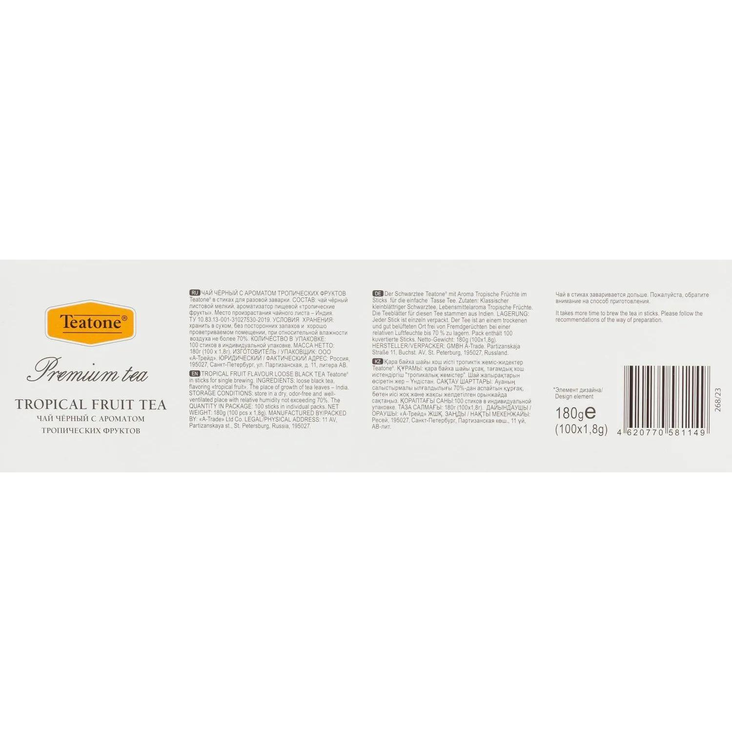 Чай чёрный Teatone 100 стиков (тропические фрукты). Чай чёрный с ароматом тропических фруктов Teatone в стиках для разовой заварки. Глубокий вкус чёрного чая и тонкие нотки тропических фруктов — это аромат лета и дух путешествий в одной кружке. Секретный рецепт лёгкости и хорошего настроения, которым хочется поделиться.<br><b>Состав:</b> чай чёрный листовой мелкий, ароматизатор пищевой «тропические фрукты».<br><b>Способ приготовления:</b> залить стик кипятком, дать чаю настояться 3-5 минут.<br>Количество пакетиков в упаковке: 100 штук.<br><b>Тип упаковки:</b> картонная коробка.<br><b>Условия хранения:</b> хранить в чистом, хорошо вентилируемом помещении без посторонних запахов при относительной влажности воздуха не более 70%.<br><b>Страна производства:</b> Россия.