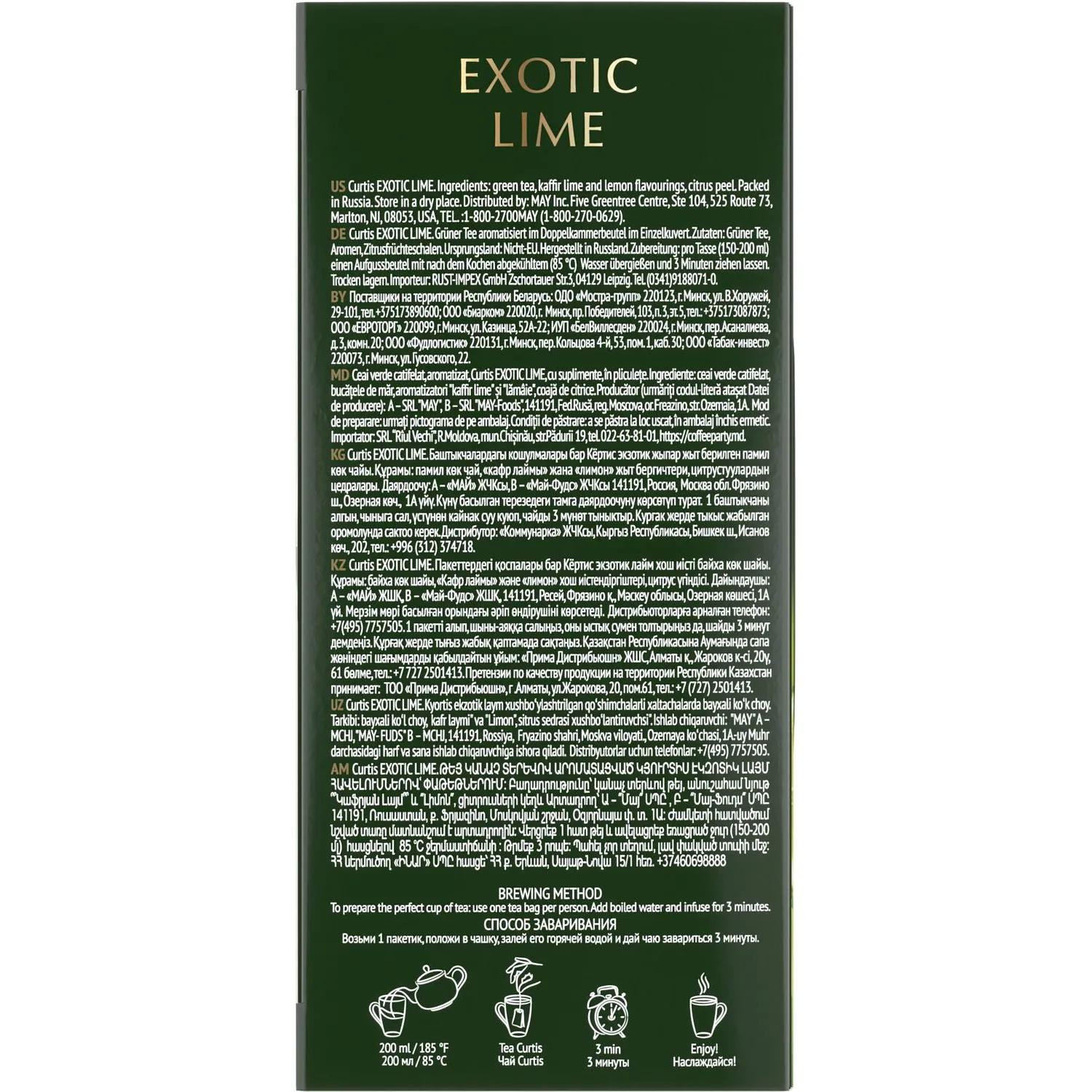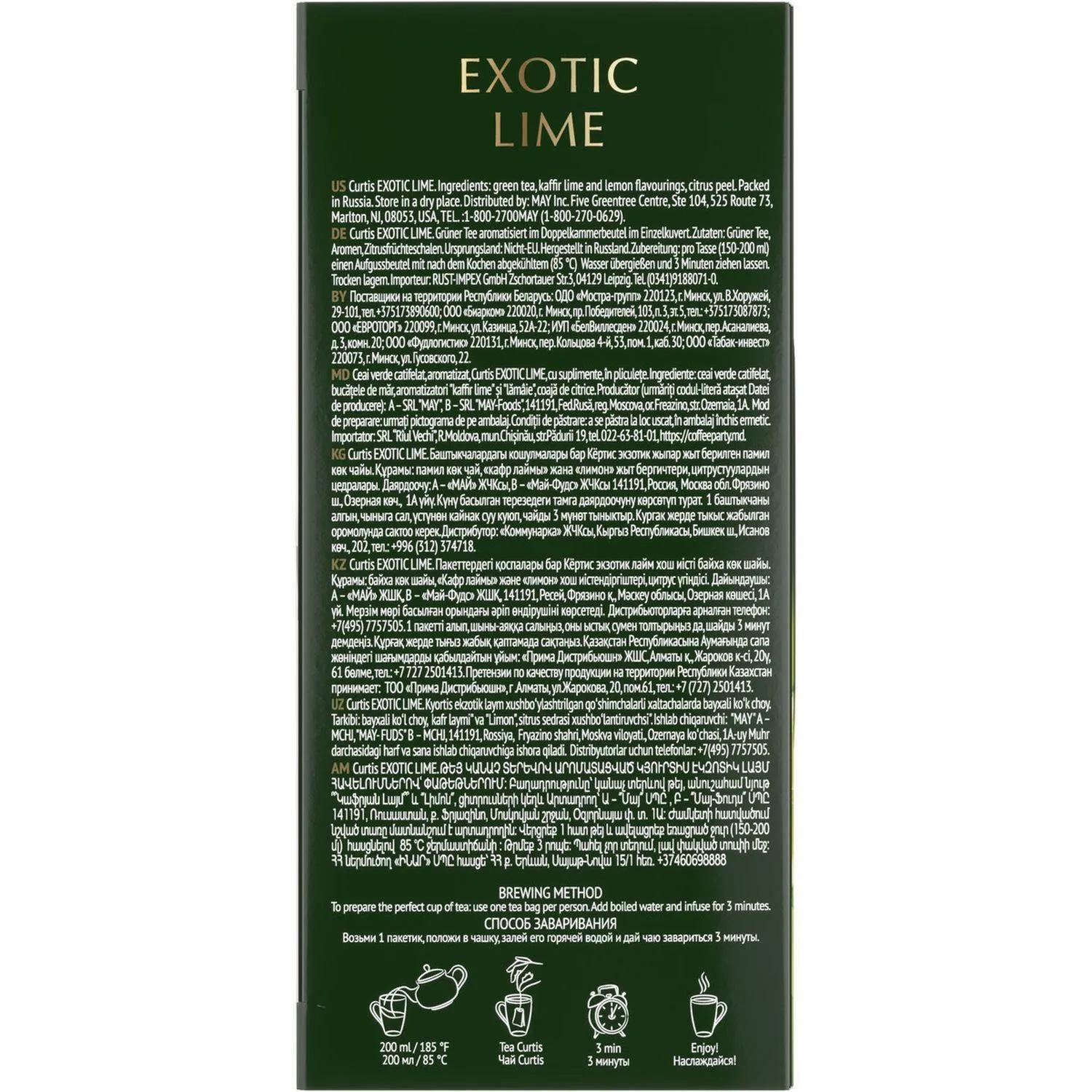 Чай зелёный Curtis Exotic Lime 25 сашет. Чай Curtis Exotic Lime зелёный в пакетиках с ароматом лайма и цедрой цитрусовых. Насладись свежестью цитрусового вкуса для яркого дня. Особенности: освежающий натуральный аромат кафрского лайма. Яркий цитрусовый аромат.<br><b>Состав:</b> чай зелёный байховый, ароматизаторы «кафрский лайм» и «лимон», цедра цитрусовых.<br><b>Способ приготовления:</b> залить чай кипятком, дать чаю настояться 3-5 минут.<br>Количество пакетиков в упаковке: 25 штук.<br><b>Тип упаковки:</b> картонная коробка.<br><b>Условия хранения:</b> хранить в чистом, хорошо вентилируемом помещёнии без посторонних запахов при относительной влажности воздуха не более 70%.<br><b>Страна производства:</b> Россия.