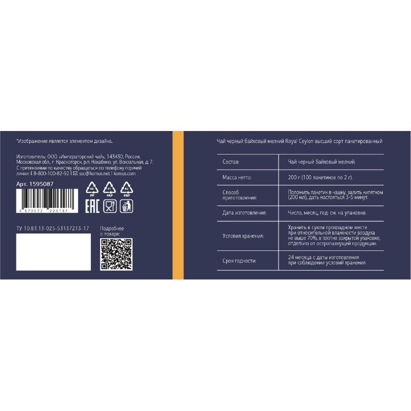 Чай Деловой Стандарт Roayl Ceylon черный 100 пакетиков. Почувствуйте великолепие одного из самых знаменитых чаев мира с Royal Ceylon. Восхитительная интерпретация классического вкуса с изысканным характером — чистый, свежий, яркий и выразительный с легким терпким привкусом. «Selected quality» — это новая яркая серия восхитительных чаев и настоев с уникальным характером. Купажи самого высокого качества созданы из отборных сортов лучших чайных плантаций мира. Каждая смесь уникальна, так как является вдохновением дегустаторов чая, которые выбрали лучшее, исключительно для ценителей чая. Побалуй себя изысканным ярким вкусом!<br><b>Состав:</b> чай черный байховый мелкий.<br><b>Способ приготовления:</b> залить чай кипятком, дать чаю настояться 3-5 минут.<br>Количество пакетиков в упаковке: 100 штук.<br><b>Тип упаковки:</b> картонная коробка.<br><b>Условия хранения:</b> хранить в чистом, хорошо вентилируемом помещении без посторонних запахов при относительной влажности воздуха не более 70%.<br><b>Страна производства:</b> Россия.