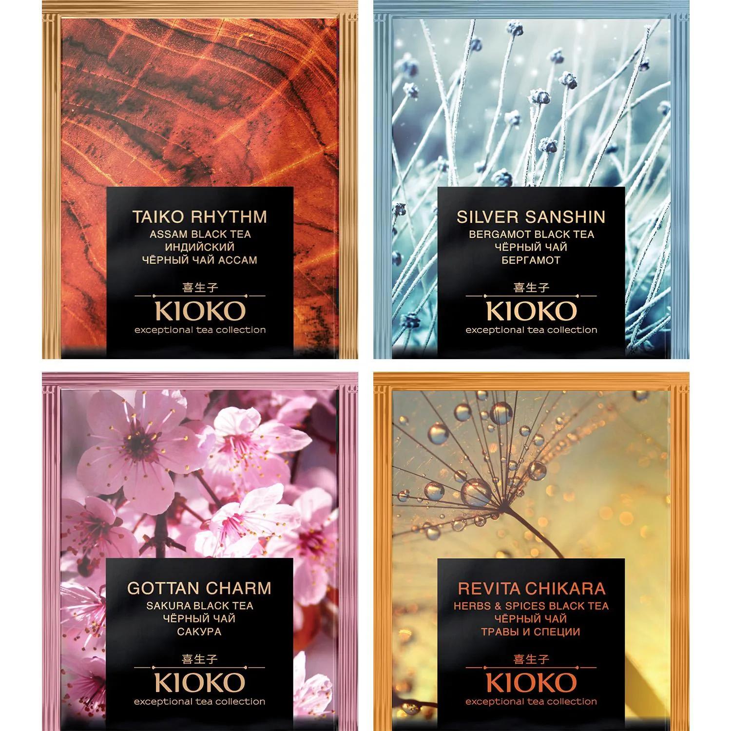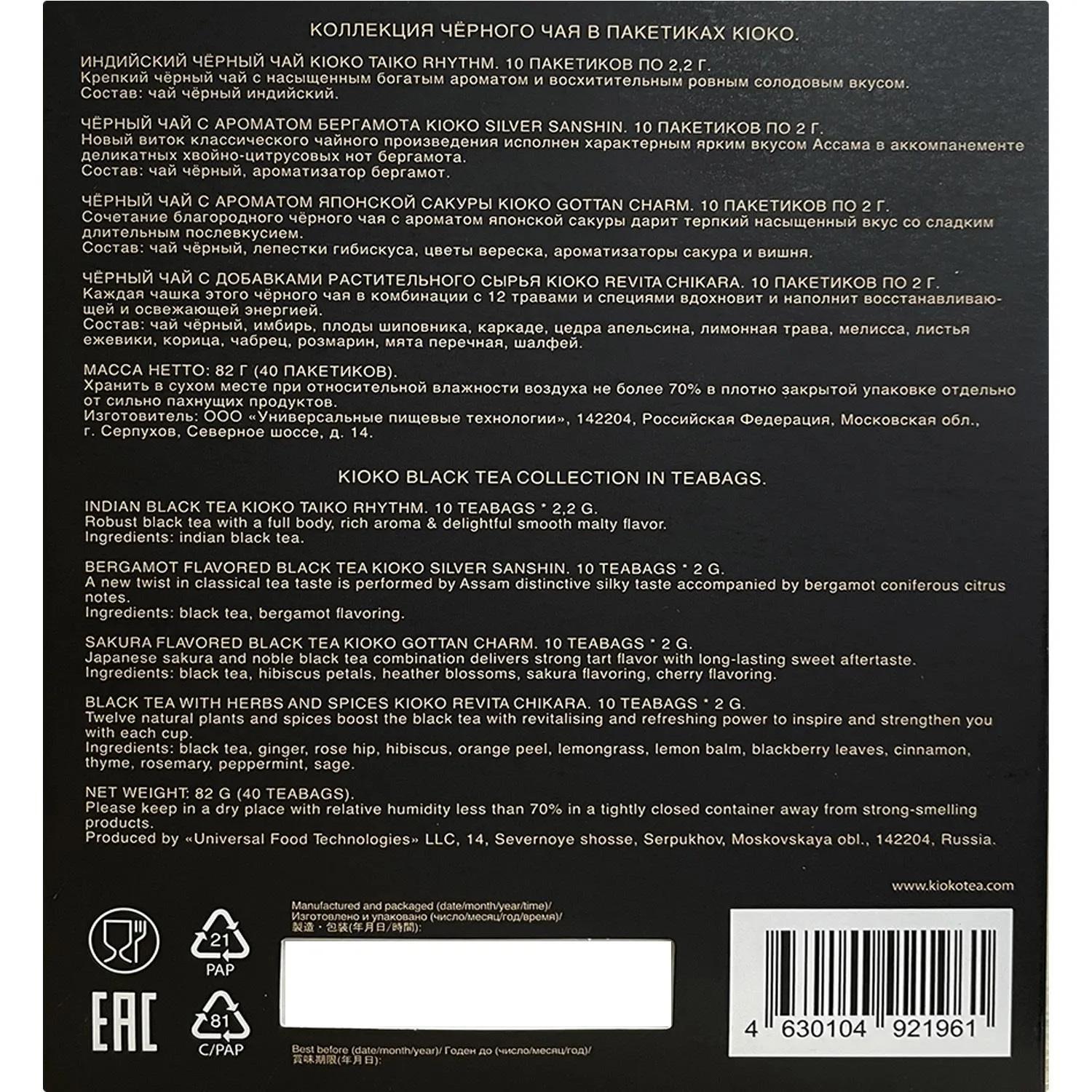 Чай чёрный Kioko Black Tea Collection 40 пакетиков<br><br>Набор из четырёх видов чёрного пакетированного чая в новогоднем подарочном оформлении Kioko Black Tea Collection включает классический индийский Ассам Taiko Rtythm, чай с двенадцатью душистыми травами и специями Revita Chikara, чай с ароматом сакуры Gottan Charm и чай с ароматом бергамота Silver Sanshin.<br><b>Состав:</b> <br>Taiko Rhythm: чай чёрный индийский; <br>Gottan Charm: чай чёрный, лепестки гибискуса, цветы вереска, ароматизаторы сакура и вишня;<br>Revita Chikara: чай чёрный, имбирь, плоды шиповника, каркаде, цедра апельсина, лимонная трава, мелисса, листья ежевики, корица, чабрец, розмарин, мята перечная, шалфей; <br>Silver Sanshin: чай чёрный, ароматизатор бергамот.<br><b>Способ приготовления:</b> заварить горячей водой 100ºС и дать настояться 2-3 минуты.<br><b>Вес / количество пакетиков в упаковке:</b> 82 г / 40 пакетиков.<br><b>Тип упаковки:</b> картонная коробка.<br><b>Условия хранения:</b> хранить в сухом месте при относительной влажности воздуха не более 70% в плотно закрытой упаковке отдельно от сильно пахнущих продуктов.<br><b>Страна производства:</b> Россия.