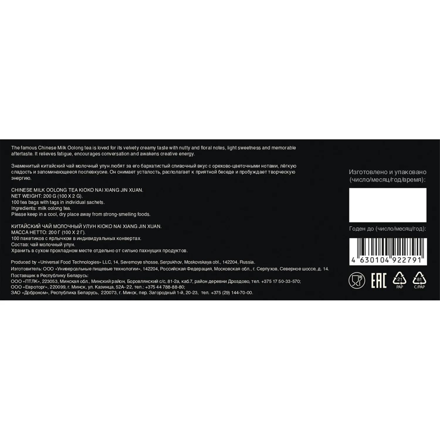 Чай Kioko представляет собой молочный улун с характерным сладко-сливочным ароматом и мягким вкусом с орехово-цветочными нотами. Напиток отличается сбалансированным профилем и подходит для спокойного чаепития в течение дня.<br><br><b>Состав</b>: чай — молочный улун.<br><br><b>Способ приготовления</b>: чай заливают водой температурой 100 °C и настаивают 2–3 минуты до раскрытия вкуса и аромата.<br><br><b>Вес/количество пакетиков в упаковке</b>: чай расфасован в стандартные пакетики по 2 г, каждый из которых помещён в индивидуальный конверт. В упаковке содержится 100 пакетиков общим весом 200 г.<br><br><b>Тип упаковки</b>: картонная коробка.<br><br><b>Условия хранения</b>: хранить рекомендуется в сухом прохладном месте при относительной влажности воздуха не более 70% в плотно закрытой упаковке отдельно от сильно пахнущих продуктов. Срок хранения составляет 36 месяцев.<br><br><b>Страна производства</b>: Россия.