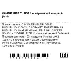 Чай листовой чёрный Caykur Rize Turist 1 кг<br><br>Откройте для себя магию турецкого чая!<br>Caykur Rize Turist — это воплощение традиций турецкого чаепития в каждой чашке. Богатый, насыщенный вкус и неповторимый пряный аромат этого листового чёрного чая перенесёт вас в живописные чайные сады Ризы, где рождаются лучшие чайные традиции Турции.<br>Срок хранения: до 3 лет при правильном хранении.<br><br>Подарите себе моменты истинного удовольствия с Caykur Rize Turist — чаем, который выбирают истинные ценители. Богатый, пряный вкус этого турецкого чая станет идеальным дополнением к вашим особенным моментам и повседневным чаепитиям.Энергетическая ценность всего 1 ккал на 100 г делает этот чай не только вкусным, но и диетически правильным выбором для тех, кто следит за здоровьем.<br><br><b>Состав:</b> чай чёрный байховый.<br><b>Способ приготовления:</b> добавьте 1 чайную ложку чая в чашку на 250 мл воды, дайте настояться 3–5 минуты.<br><b>Вес:</b> 1 кг.<br><b>Тип упаковки:</b> пакет.<br><b>Условия хранения:</b> хранить в сухом, прохладном, чистом и без запахов помещении при относительной влажности воздуха, не превышающей 70%, в плотно закрытой упаковке.<br><b>Страна производства:</b> Турция.