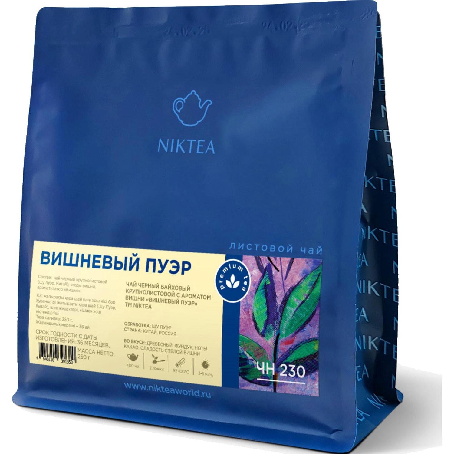 Чай листовой чёрный Niktea Вишнёвый пуэр 250 г (вишня)<br><br>Богатый пуэр с яркими акцентами спелой вишни, создающий необычное сочетание древесных и ягодных оттенков. Его глубокий, тёплый вкус с лёгкой сладостью и длительным послевкусием прекрасно подходит для тех, кто ищет новые грани традиционного пуэра.<br><br><b>Состав:</b> чай чёрный (шу пуэр) крупнолистовой, ягоды вишни, ароматизатор «Вишня».<br><b>Способ приготовления:</b> 2 чайные ложки залить горячей водой, дать настояться 3-5 минут.<br><b>Вес:</b> 250 г.<br><b>Тип упаковки:</b> пакет.<br><b>Условия хранения:</b> хранить в сухом прохладном месте, отдельно от сильнопахнущих продуктов.<br><b>Страна производства:</b> Россия.