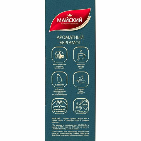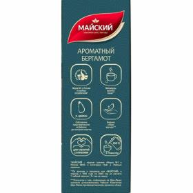 Чай черный Майский Ароматный Бергамот 100 пакетиков. Цейлонский черный чай с легкой благородной горчинкой бергамота и освежающим цветочным послевкусием, которое идеально дополняет и мягко балансирует цитрус. Благородный вкус со свежими цитрусовыми нотами. Чай для самых теплых моментов! Он создает атмосферу для живого искреннего общения, помогает поддерживать связь с близкими и чувствовать тепло и поддержку. В основе чая натуральные ингредиенты, сбалансированные вкусовые профили и насыщенный свежий аромат. Наслаждайтесь чаепитием в кругу близких, заварив ароматный чай. Состав: чай черный байховый цейлонский, ароматизатор бергамот, цедра цитрусовых. Способ приготовления: залейте пакетик вскипевшей водой, дайте напитку настояться 4 минуты. Вес / количество пакетиков в упаковке: общий вес - 150 г, количество пакетиков - 100 шт. Тип упаковки: картонная коробка. Условия хранения: хранить в закрытой упаковке, вдали от предметов, имеющих сильный запах, при относительной влажности воздуха не выше 70 %. Страна производства: Россия.