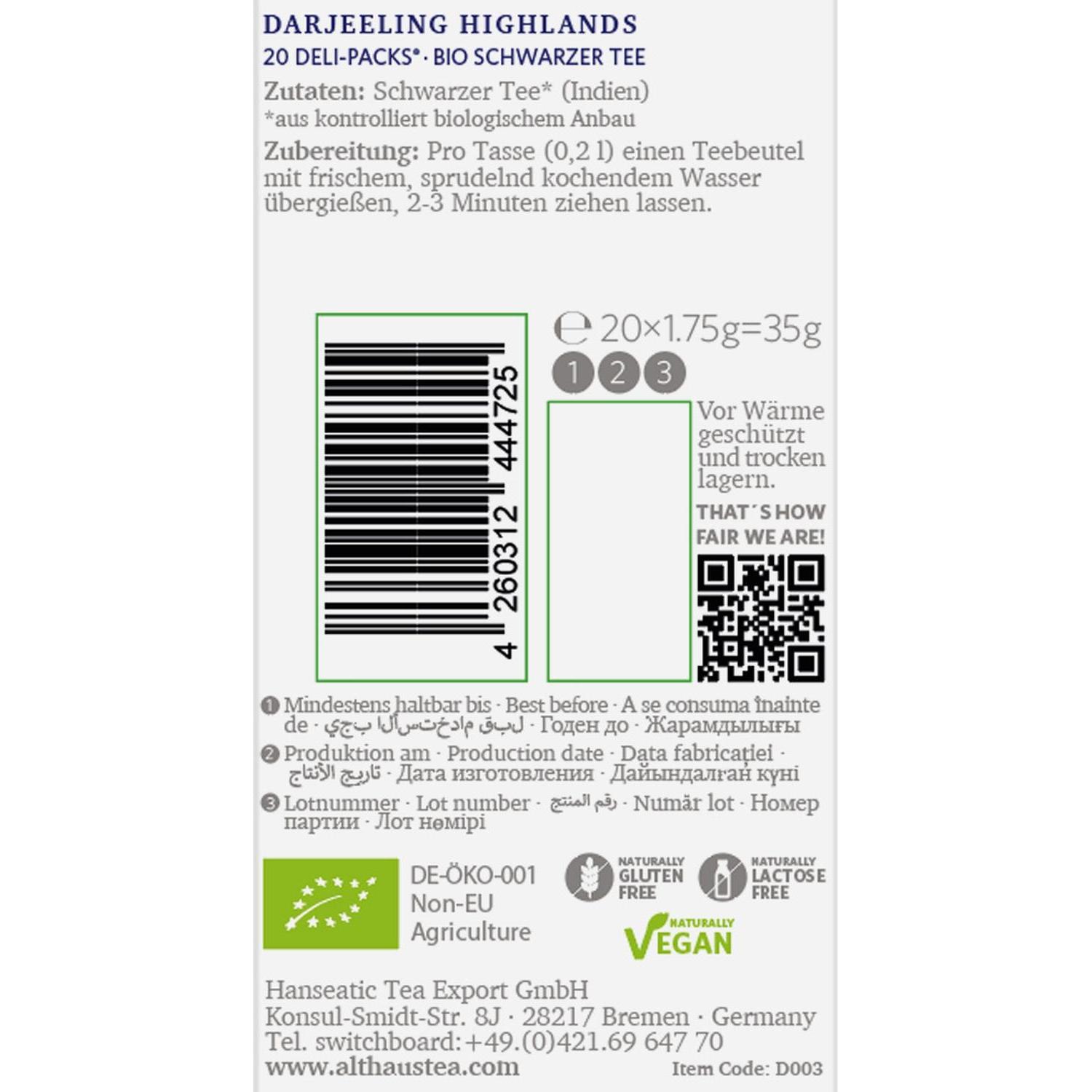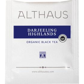 Чай чёрный Althaus Darjeeling Highlands 20 пакетиков<br><br>Превосходный высокогорный чай органического происхождения из садов Дарджилинга. Раскрывается в нежном букете с лёгкими ореховыми и фруктовыми полутонами и мускатным ароматом.<br>При изготовлении пакетированного чая Althaus используется то же высококачественное сырье, что и при изготовлении листового чая. Мелкая фракция чая в пакетиках обеспечивает более крепкий настой и быстрое заваривание. Специальная фильтр-бумага, из которой производятся пакетики, не влияет на вкус чая. <br><b>Состав:</b> чай чёрный байховый мелкий высший сорт.<br><b>Способ приготовления:</b> залить пакетик горячей водой и дать настояться 2-3 минуты.<br><b>Вес / количество пакетиков в упаковке:</b> 35 г / 20 пакетиков.<br><b>Тип упаковки:</b> картонная коробка.<br><b>Условия хранения:</b> хранить в чистых, сухих, не заражённых вредителями помещениях с относительной влажностью воздуха не более 75% и температурой воздуха не более 25°С.<br><b>Страна производства:</b> Германия.