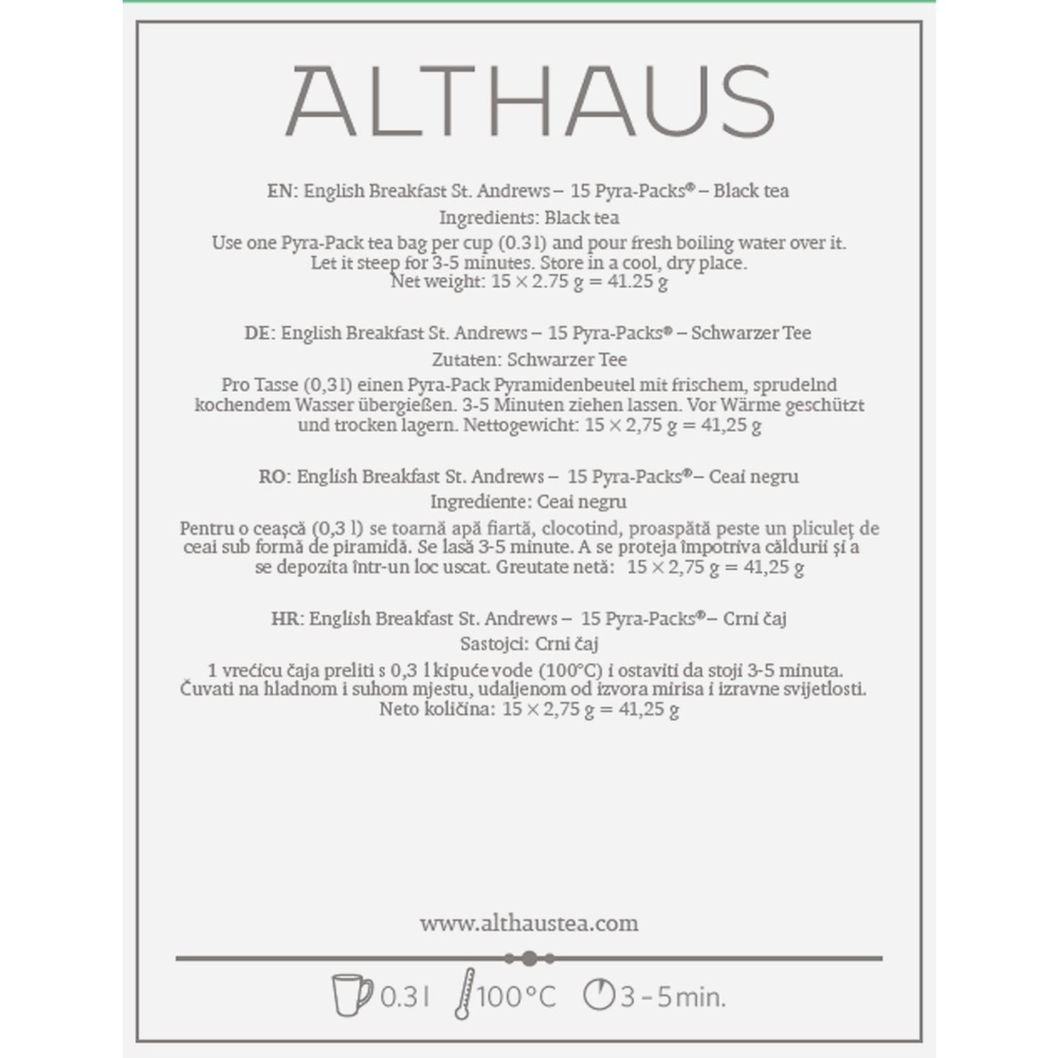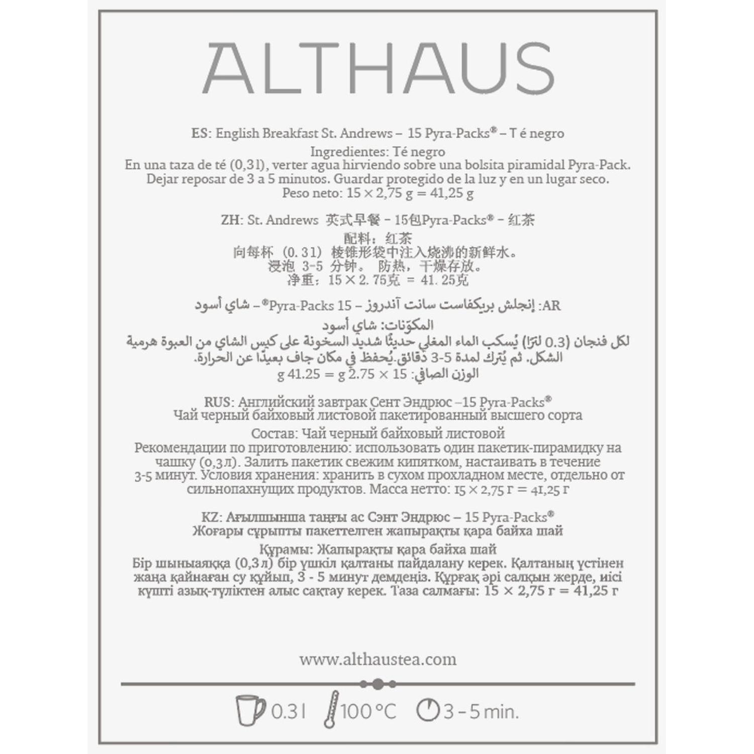 Чай чёрный Althaus English Breakfast St. Andrews 15 пакетиков<br><br>Традиционный чай Английский завтрак — насыщенный купаж отборных чёрных чаёв, свежий и ароматный. В любое время дня этот крепкий чай превосходно сочетается с молоком.<br>Чайные пирамидки Althaus Pyra-Pack — это качественный листовой чай в инновационном формате фасовки.<br>Пирамидки изготовлены из нейлона, который никак не влияет на свойства напитка, поскольку не обладает запахом и не разрушается под действием кипятка.<br>Чайные листочки, не стеснённые лёгким, почти невесомым материалом, который благодаря своей сетчатой структуре обладает отличной пропускной способностью, моментально насыщаются влагой и быстро раскрываются, отдавая максимум вкусовых и ароматических веществ в настой.<br>Чай в пирамидках получается особо насыщенным и душистым, как и рассыпной чай Althaus. <br><b>Состав:</b> чай чёрный байховый листовой.<br><b>Способ приготовления:</b> использовать один пакетик на чашку, залить кипятком, настаивать 3-5 минут.<br><b>Вес / количество пакетиков в упаковке:</b> 41.25 г / 15 пакетиков.<br><b>Тип упаковки:</b> картонная коробка.<br><b>Условия хранения:</b> хранить в сухом прохладном месте, отдельно от сильнопахнущих продуктов.<br><b>Страна производства:</b> Германия.