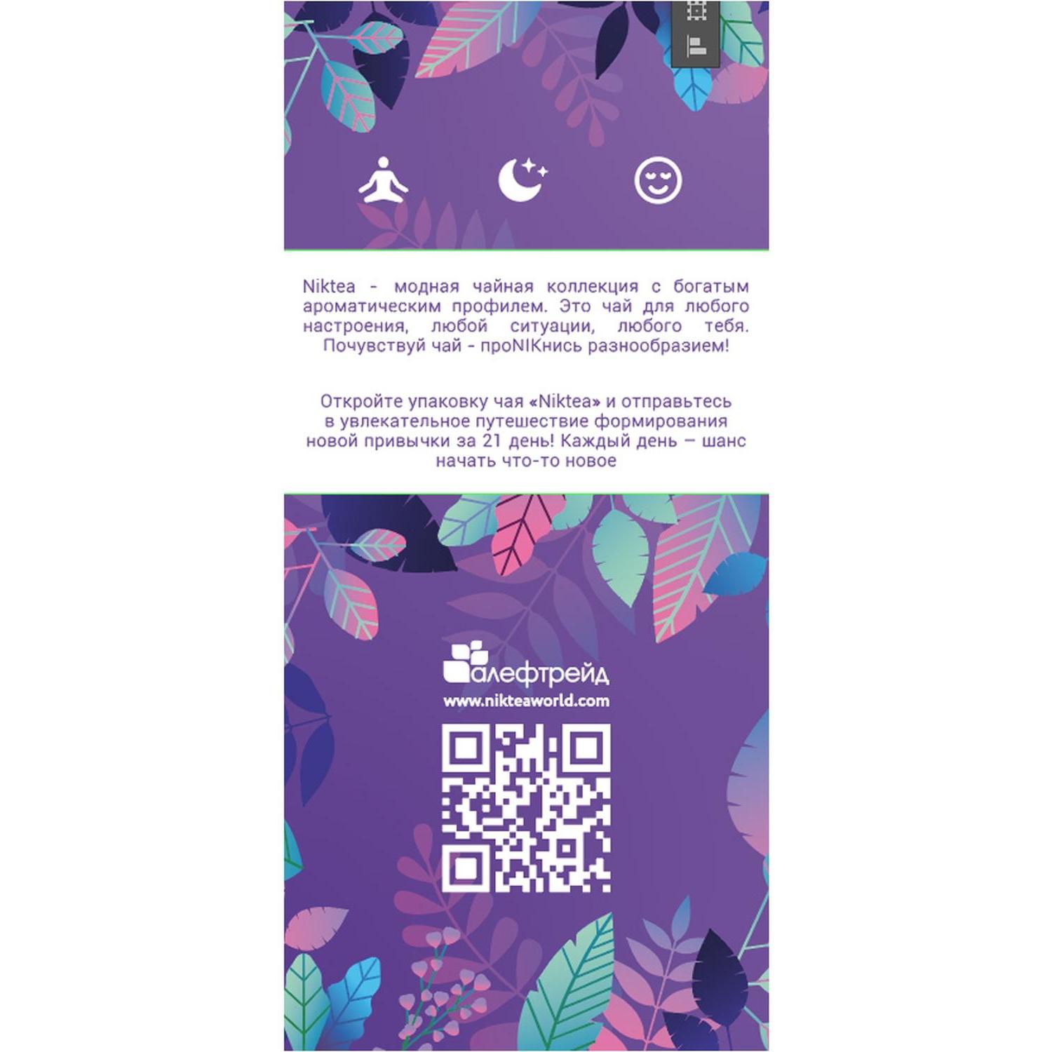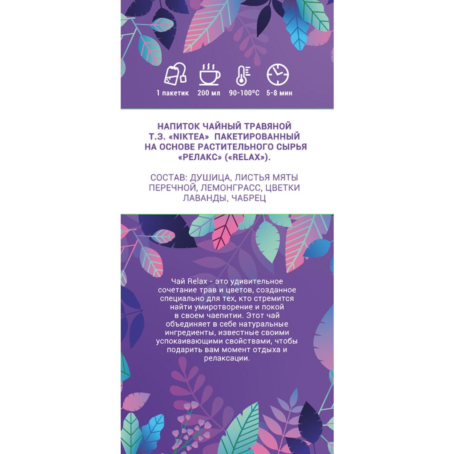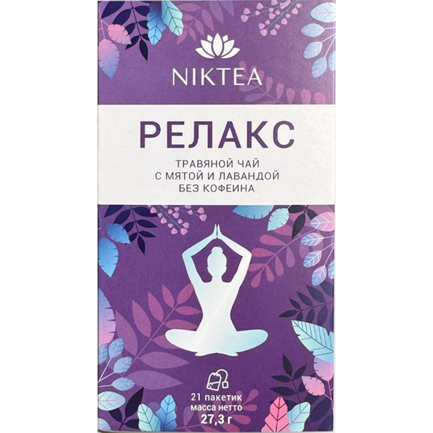 Чай травяной Niktea Релакс 21 пакетик<br><br>Niktea Релакс — это уникальное сочетание трав и цветов создаёт чай «Релакс» — напиток, который приглашает вас на уютное чаепитие, помогая расслабиться и освободиться от стресса. Наслаждайтесь каждым глотком этого чая в тишине и покое, находя в нем источник умиротворения в любое время дня.<br>Листья мяты перечной: привносят свежесть и нежность в каждый глоток чая, создавая при этом лёгкую прохладу и освежающий аромат.<br>Душица: добавляет в чай терпкость и нотки приятной пряности, помогает успокоить нервы, улучшить качество сна.<br>Лемонграсс: добавляет свежести и цитрусовых нот, придающих чаю лёгкость и освежающий аромат.<br>Чабрец: улучшает настроение и помогает повысить иммунитет. Придаёт приятную свежесть и пряность.<br>Лаванда: придают чаю нежный и успокаивающий аромат, помогая создать атмосферу спокойствия и релаксации.<br><b>Состав:</b> душица, листья мяты перечной, лемонграсс, цветки лаванды, чабрец.<br><b>Способ приготовления:</b> один пакетик залить горячей водой, настаивать 5-8 минут.<br><b>Вес / количество пакетиков в упаковке:</b> 27.3 г / 21 пакетик.<br><b>Тип упаковки:</b> картонная коробка.<br><b>Условия хранения:</b> хранить в сухом прохладном месте, отдельно от сильнопахнущих продуктов.<br><b>Страна производства:</b> Россия.