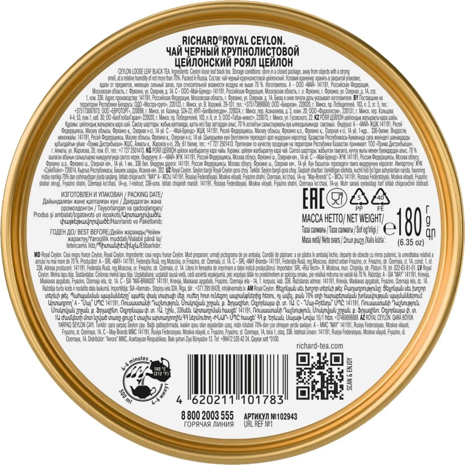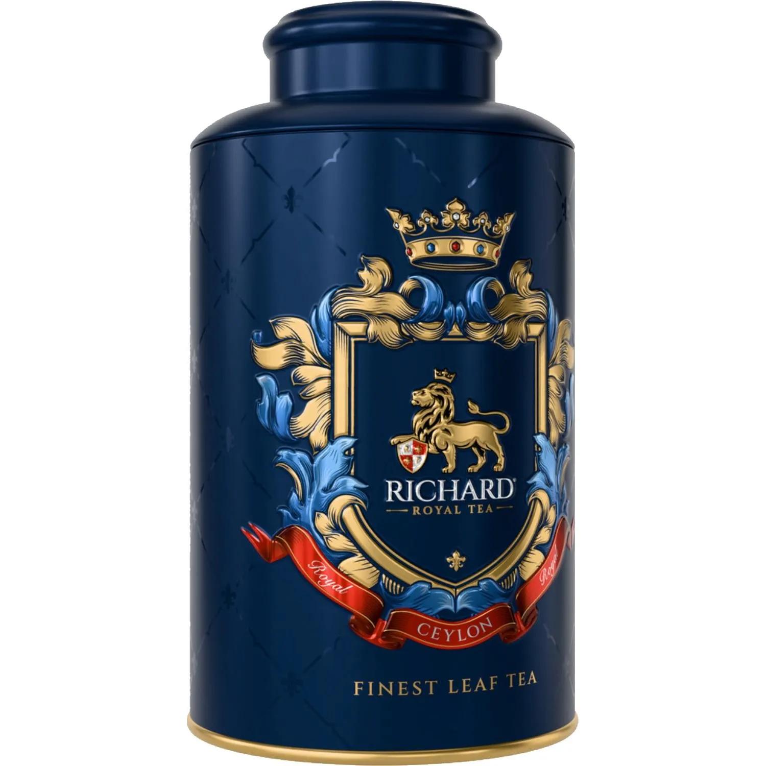 Чай листовой чёрный Richard Royal Ceylon 180 г<br><br>Чай листовой чёрный представлен в коллекции цейлонских сортов и отличается терпким вкусом с мягкими сладковатыми нотами и насыщенным ароматом. Продукт выполнен в подарочной упаковке с королевским гербом, что делает его подходящим выбором для праздничного чаепития и в качестве презента.<br><br><b>Состав.</b><br>Чай чёрный крупнолистовой цейлонский.<br><br><b>Способ приготовления.</b><br>Ополосните заварочный чайник кипятком. Засыпьте 2–3 чайные ложки на 500 мл воды. Залейте кипятком при температуре 100 °C и дайте настояться 4–6 минут.<br><br><b>Вес.</b><br>180 г.<br><br><b>Тип упаковки.</b><br>Жестяная банка.<br><br><b>Условия хранения.</b><br>Хранить в закрытой упаковке, вдали от предметов с сильным запахом, при относительной влажности воздуха не выше 70 %. Срок хранения — 36 месяцев от даты производства.<br><br><b>Страна производства.</b><br>Не указана.