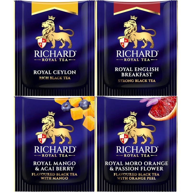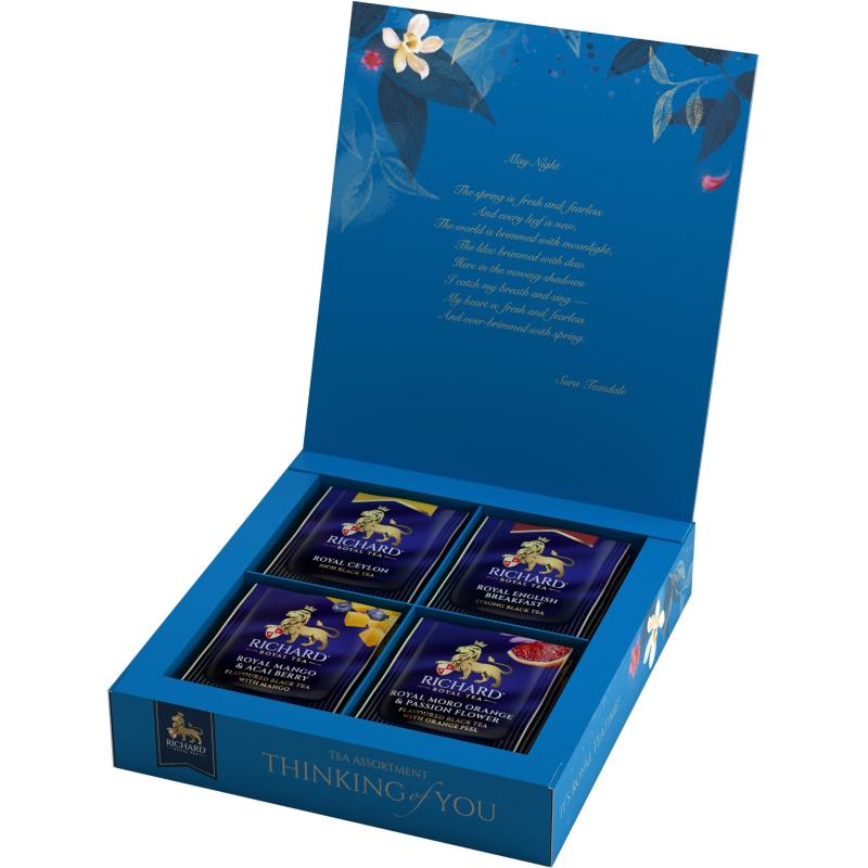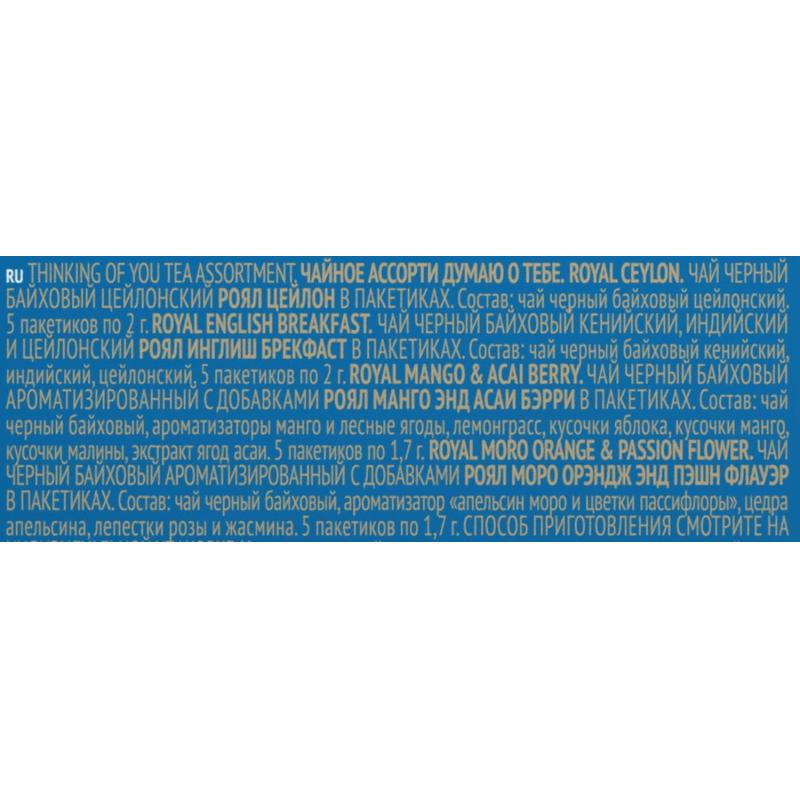 Чай ассорти Richard Thinking of You 20 пакетиков. Этот восхитительный набор объединяет в себе как любимые бестселлеры, так и вдохновляющие новинки, наполненные кусочками ароматных фруктов. Чай в роскошной упаковке с золотым тиснением станет отличным подарком или эксклюзивным угощением для самых дорогих гостей. Состав: Royal Ceylon - чай чёрный байховый цейлонский Роял Цейлон в пакетиках. Состав: чай чёрный байховый цейлонский. 5 пакетиков по 2 г. Royal English Breakfast - чай чёрный байховый кенийский, индийский и цейлонский Роял Инглиш Брекфаст в пакетиках. Состав: чай чёрный байховый кенийский, индийский, цейлонский. 5 пакетиков по 2 г. Royal Mango & Acai Berry - чай чёрный байховый ароматизированный с добавками Роял Манго энд Асаи Бэрри в пакетиках. Состав: чай чёрный байховый, ароматизаторы - манго и лесные ягоды, лемонграсс, кусочки яблока, кусочки манго, кусочки малины, экстракт ягод асаи. 5 пакетиков по 1,7 г. Royal Moro Orange & Passion Flower - чай чёрный байховый ароматизированный с добавками Роял Моро Орэндж энд Пэшн Флауэр в пакетиках. Состав: чай чёрный байховый, ароматизатор - апельсин моро и цветки пассифлоры, цедра апельсина, лепестки розы и жасмина. 5 пакетиков по 1,7 г. Способ приготовления: залейте кипятком (100 C) один сашет, заваривайте 5 минут. Вес и количество пакетиков в упаковке: 20 сашетов по 1,7 г. Общий вес - 37 г. Тип упаковки: картонная коробка. Условия хранения: хранить в закрытой упаковке, вдали от предметов, имеющих сильный запах, при относительной влажности воздуха не выше 70 %. Страна производства: Россия.