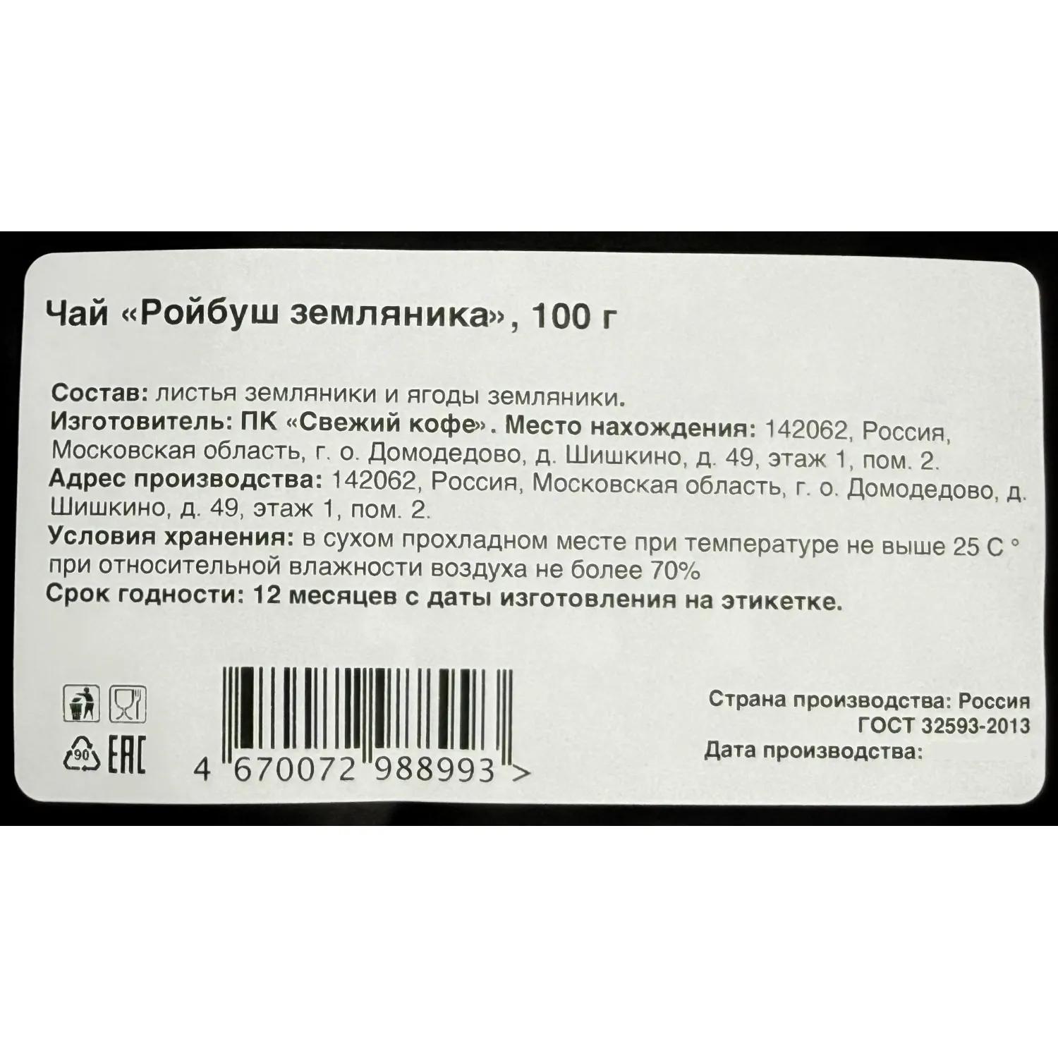 Напиток из листьев и стеблей аспалатуса линейного родом из Южной Африки. Имеет уникальный состав, в котором отсутствует кофеин и содержится немного полифенолов. Вкус мягкий и нежный, хорошо сочетается с добавками. Аромат этого фиточая яркий и запоминающийся, в нем лидируют аппетитные сладкие ягоды земляники и лёгкая нота сливок.<br>Настой плотный, гладкий, сладкий, тягучий. Вкус приятный, плавный, ягодно-сливочный, с тонкими цитрусово-фруктовыми нотами и цветами в послевкусии. Насыщенный вкус и аромат, ровное состояние — этот фиточай будет уместен в любую погоду и любое время суток. Для приготовления подойдёт фарфоровый, стеклянный чайник или чашка. Чай хорошо раскрывается настаиванием.<br><b>Состав:</b> листья земляники и ягоды земляники. <br><b>Способ приготовления:</b> залить горячей водой с температурой 90 С и настаивать 3-4 минуты.<br><b>Вес:</b> 100 г.<br><b>Тип упаковки:</b> пакет. <br><b>Условия хранения:</b> хранить в сухом прохладном месте при температуре не выше 25 С при относительной влажности воздуха не более 70%. <br><b>Страна производства:</b> Россия.