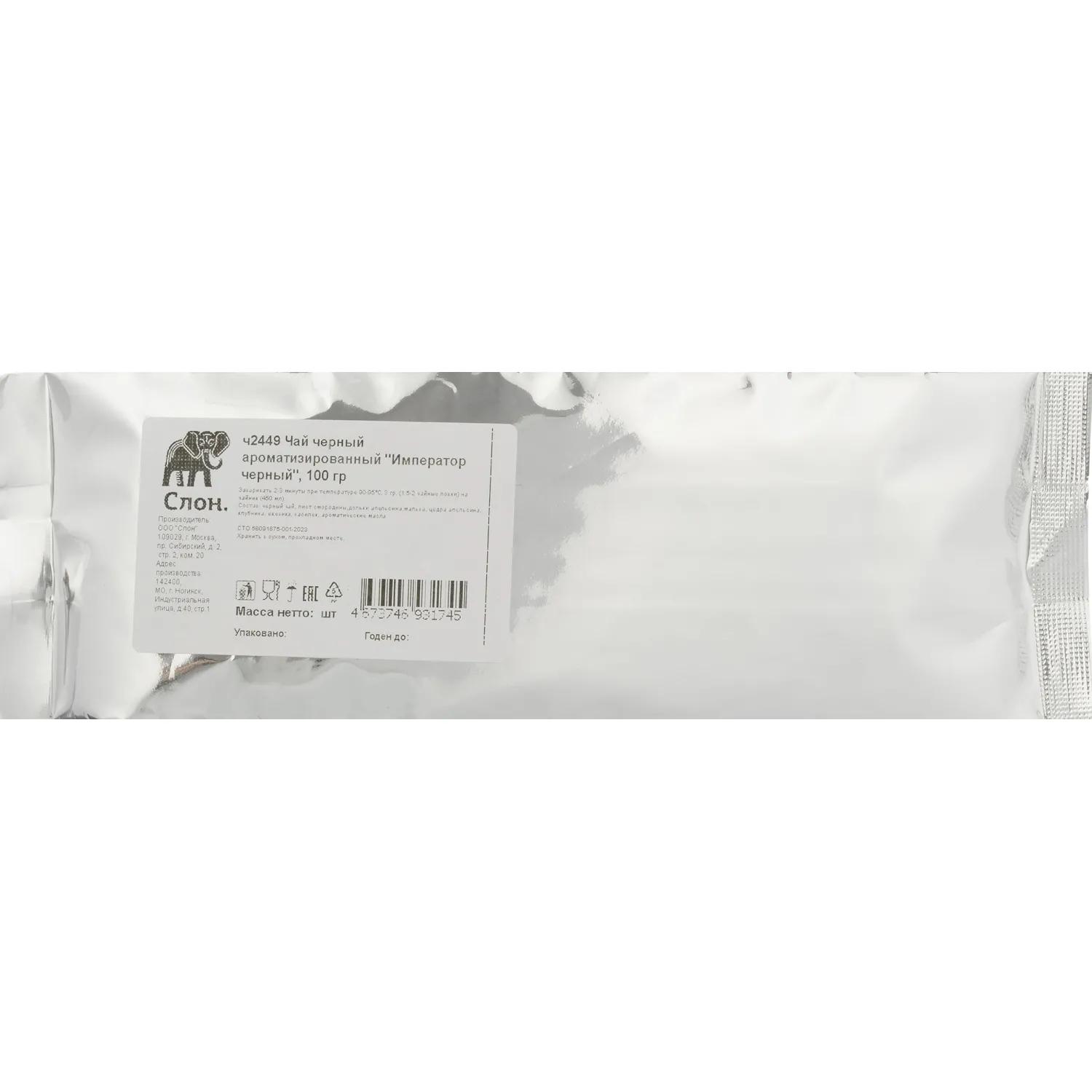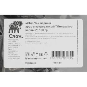 Чай листовой чёрный Слон Император.<br><b>Состав:</b> чёрный чай, лист смородины, дольки апельсина, мальва, цедра апельсина, сублимированная клубника, сублимированная ежевика, василёк, ароматические масла. <br><b>Способ приготовления:</b> заваривать 2-4 минуты при температуре 90-95°С, 3 г (1.5-2 чайные ложки) на чайник (450-500 мл).<br><b>Вес:</b> 100 г.<br><b>Тип упаковки:</b> пакет.<br><b>Условия хранения:</b> хранить в сухом, прохладном месте, без ярко выраженных сторонних запахов.<br><b>Страна производства:</b> Россия.