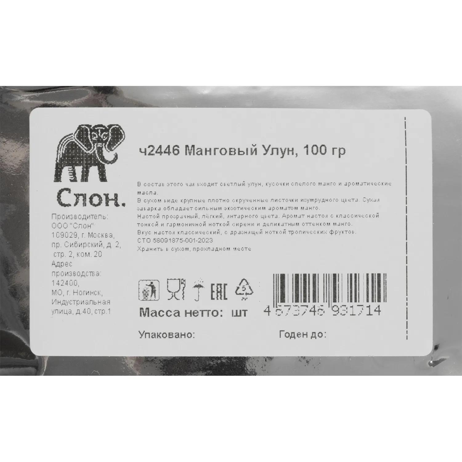 Сухая заварка обладает сильным экзотическим ароматом манго. Настой прозрачный, лёгкий, янтарного цвета. Аромат настоя с классической тонкой и гармоничной ноткой сирени и деликатным оттенком манго. Вкус настоя классический, с дразнящей ноткой тропических фруктов. <br><b>Состав:</b> тайваньский бирюзовый чай, кусочки манго, ароматизатор.<br><b>Способ приготовления:</b> заваривать 2-3 минуты при температуре 80-85°С, 3 г (1.5-2 чайные ложки) на чайник (450-500 мл).<br><b>Вес:</b> 100 г.<br><b>Тип упаковки:</b> пакет.<br><b>Условия хранения:</b> хранить в сухом, прохладном месте, без ярко выраженных сторонних запахов. <br><b>Страна производства:</b> Россия.