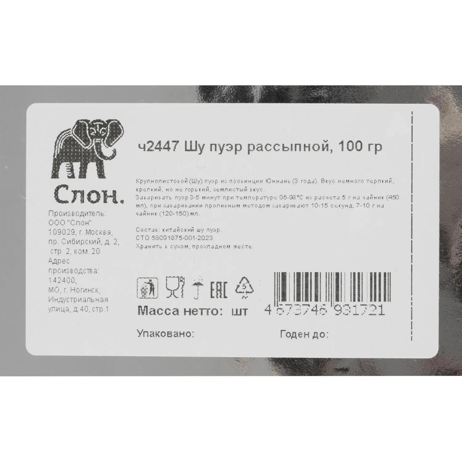 Чай листовой Слон Шу пуэр. Вкус немного терпкий, крепкий, но не горький, землистый вкус — классический для пуэра.<br><b>Состав:</b> крупнолистовой (Шу) пуэр из провинции Юннань (3 года). <br><b>Способ приготовления:</b> заваривать пуэр 3-5 минут при температуре 95-98°С из расчёта 5 г на чайник (450-500 мл), при заваривании проливным методом заваривают 10-15 секунд, 7-10 г на колбу (120-150) мл.<br><b>Вес:</b> 100 г.<br><b>Тип упаковки:</b> пакет.<br><b>Условия хранения:</b> хранить в сухом, прохладном месте, без ярко выраженных сторонних запахов.<br><b>Страна производства:</b> Россия.