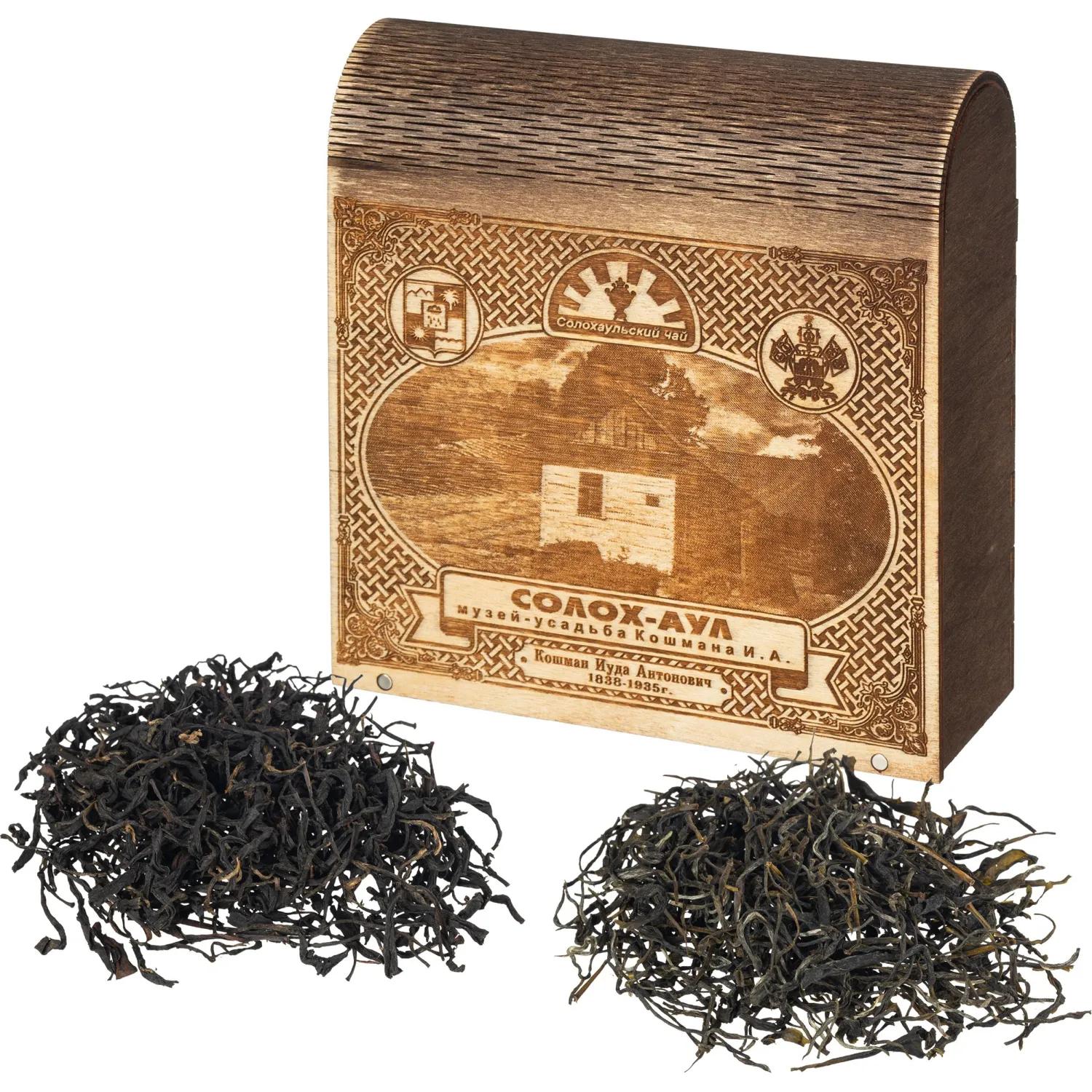 Чай ассорти. Подарочный набор «Шкатулка «Сочи». В набор входит ассорти классического чая: чёрный, зелёный. Чай выращивается на горных чайных плантациях Солохаула — Родины чая в России и собирается вручную. Собственное производство АО «Солохаульский чай». Чай имеет уникальный вкус и тонкий аромат. 100% натуральный продукт, произведён по ГОСТ «Краснодарский чай». Продукт сертифицирован. <br><b>Состав:</b> чай чёрный краснодарский, чай зелёный краснодарский. <br><b>Способ приготовления:</b> заварник обдать кипятком, засыпать чай из расчёта 1 чайная ложка на чашку чая, заварить кипятком и настаивать 5-7 минут. <br><b>Вес:</b> 60 г.<br><b>Тип упаковки:</b> деревянная шкатулка.<br><b>Условия хранения:</b> хранить при относительной влажности не более 70 %.<br><b>Страна производства:</b> Россия.