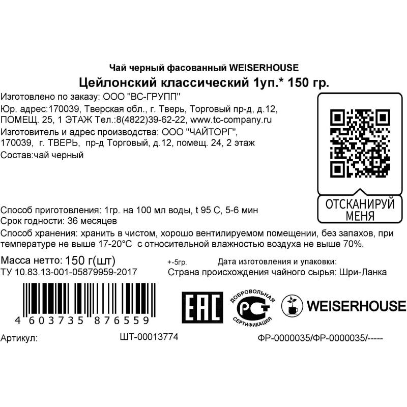 Чай Weiserhouse Цейлонский классический черный 150 г / 4dealer.ru