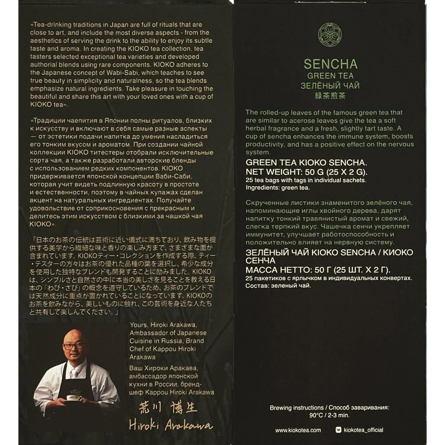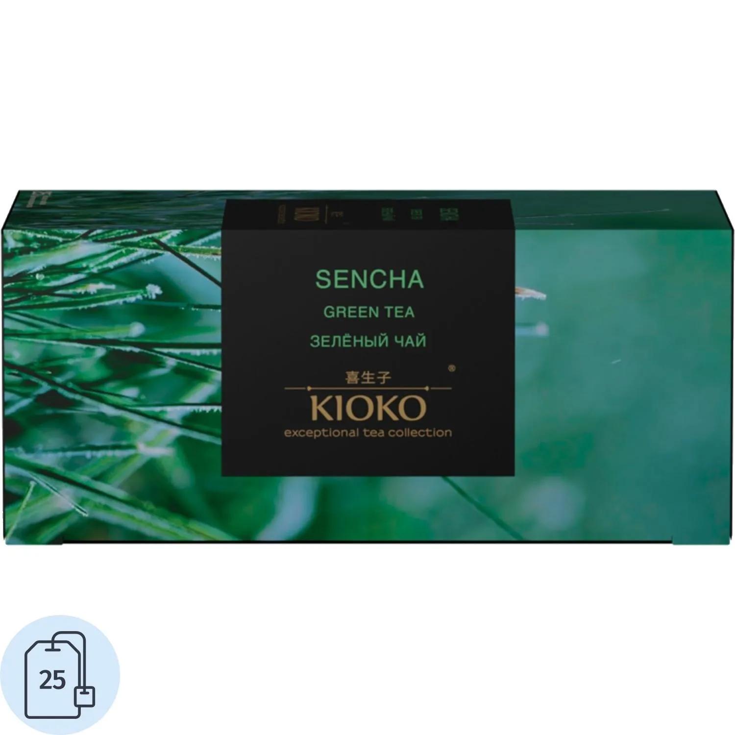 Чашечка зелёного чая Сенча от Kioko укрепляет иммунитет, улучшает работоспособность и положительно влияет на нервную систему. Чай богат антиоксидантами, витаминами, аминокислотами и йодом, снимает усталость, нормализует сон, снижает артериальное давление и уровень холестерина в организме. <br><b>Состав:</b> зелёный чай Sencha.<br><b>Способ приготовления:</b> заварить горячей водой 100 С и дать настояться 2-3 минуты.<br><b>Вес / количество пакетиков в упаковке:</b> 50 г / 25 пакетиков.<br><b>Тип упаковки:</b> картонная коробка.<br><b>Условия хранения:</b> хранить в сухом месте при относительной влажности воздуха не более 70% в плотно закрытой упаковке отдельно от сильно пахнущих продуктов. <br><b>Страна производства:</b> Россия.
