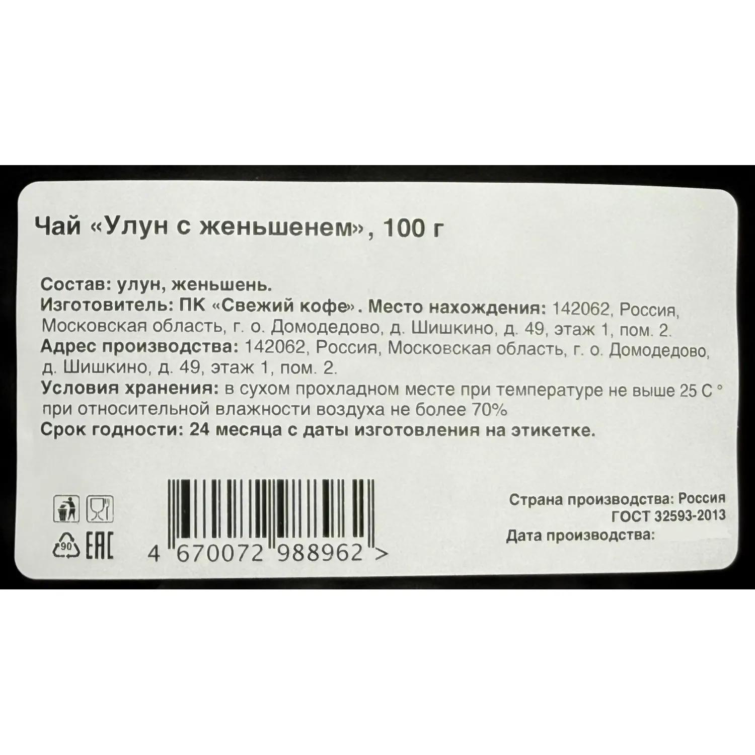 Плотно скрученные чаинки женьшеневого улуна источают насыщенный и сладкий аромат. Букет сухого чая приятный, раскрывается оттенками трав, ягод, печенья с изюмом, клубники. В теплом чайнике аромат раскрывается нотами вареной сгущёнки, орехов пекан, варенья, выпечки, карамели и молочного шоколада. Это буйство сладости оттеняет нота водорослей.<br>Настой мягкий и очень сладкий. Эта сладость заполняет полость рта, особенно ярко ощущается на щеках, за ней скрывается тонкая клубничная кислинка, а текстура настоя похожа на лёгкий фруктовый лимонад. Тело вкуса хорошо проявлено, полное и тяжёлое, вкус яркий, чёткий. В процессе чаепития аромат набирает смолистые, жареные и пряные ноты. Послевкусие стойкое — глубоко проникающая, пощипывающая сладость.<br><b>Состав:</b> улун, женьшень. <br><b>Способ приготовления:</b> залить горячей водой с температурой 90 С и настаивать 3-4 минуты. <br><b>Вес:</b> 100 г.<br><b>Тип упаковки:</b> пакет. <br><b>Условия хранения:</b> хранить в сухом прохладном месте при температуре не выше 25 С при относительной влажности воздуха не более 70%. <br><b>Страна производства:</b> Россия.