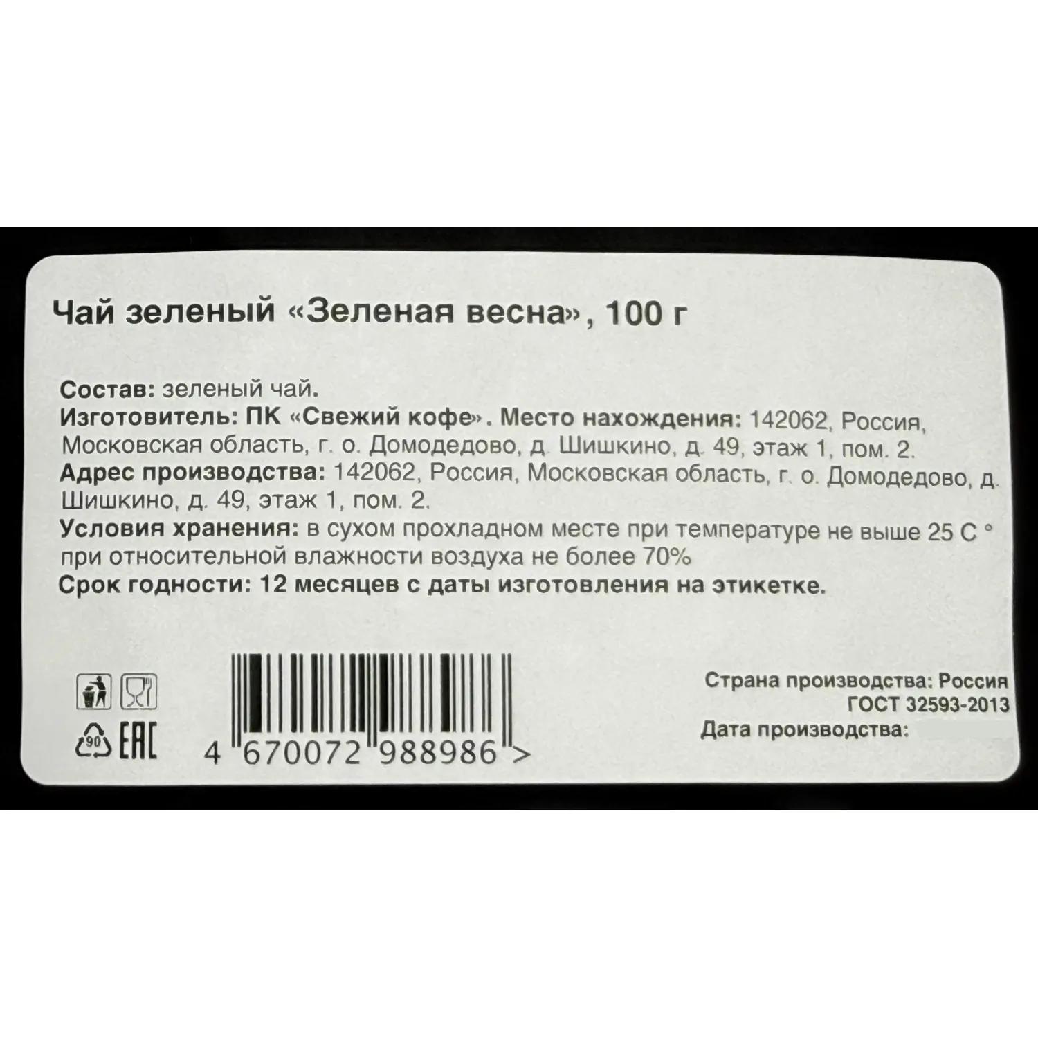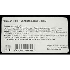 Длинные зелёные листья продольной скрутки обладают ярким, свежим ароматом. В нём угадываются оттенки молодой зелени, сладкого болгарского перца, сочного зелёного горошка и нежных цветов клевера. Эти ноты создают ощущение лёгкости и природной свежести.<br>Вкус чая насыщенный, с гармоничным балансом сладости и лёгкой терпкости. Напиток пьётся легко, оставляя после себя приятное чувство прохлады и расслабленности. Этот зелёный чай ассоциируется с весной, когда природа пробуждается, воздух наполняется ароматами цветущих лугов, а каждый глоток напоминает о начале новой жизни.<br><b>Состав:</b> зелёный чай. <br><b>Способ приготовления:</b> залить горячей водой с температурой 90 С и настаивать 3-4 минуты. <br><b>Вес:</b> 100 г.<br><b>Тип упаковки:</b> пакет. <br><b>Условия хранения:</b> хранить в сухом прохладном месте при температуре не выше 25 С при относительной влажности воздуха не более 70%. <br><b>Страна производства:</b> Россия.