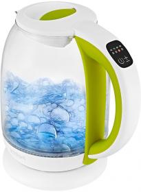Корпус чайника выполнен из экологически чистого термостойкого стекла. Он имеет большое горлышко, что облегчает доступ внутрь при мытье, а также съёмный фильтр-сетку для защиты от накипи.