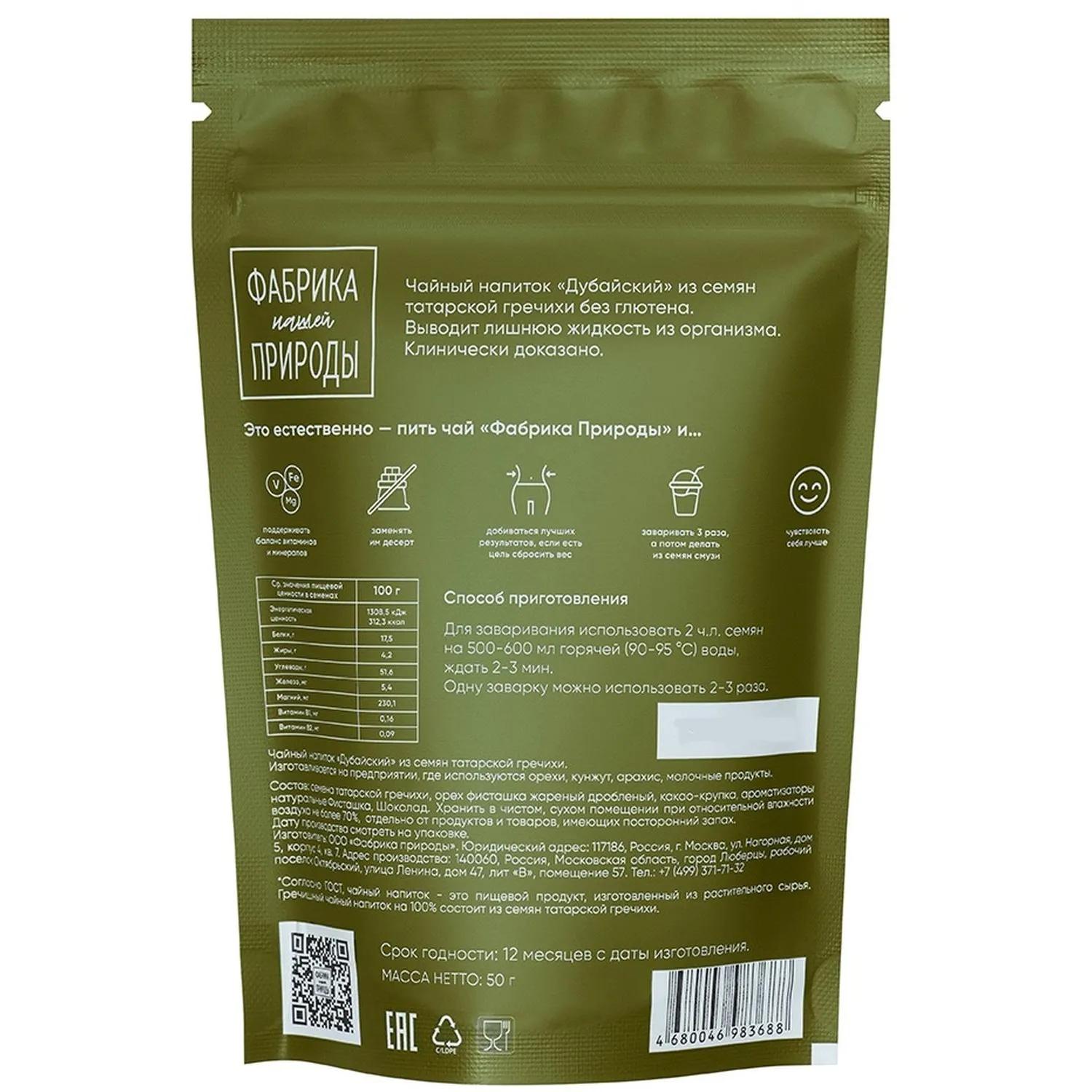 Чайный напиток Дубайский из семян татарской гречихи. Богатый вкус с нотами бисквита и шоколада. <br><b>Состав:</b> семена татарской гречихи, орех фисташка жаренный дроблёный, какао-крупка, ароматизаторы натуральные «Фисташка», «Шоколад». <br><b>Способ приготовления:</b> для заваривания использовать 2 ч.л. семян на 500-600 мл горячей воды (90-95 °С), ждать 2-3 минуты. Одну заварку можно использовать 2-3 раза.<br><b>Вес:</b> 50 г.<br><b>Тип упаковки:</b> пакет.<br><b>Условия хранения:</b> хранить в чистом, сухом помещении при относительной влажности не более 70% отдельно от продуктов и товаров, имеющих посторонний запах. <br><b>Страна производства:</b> Россия.