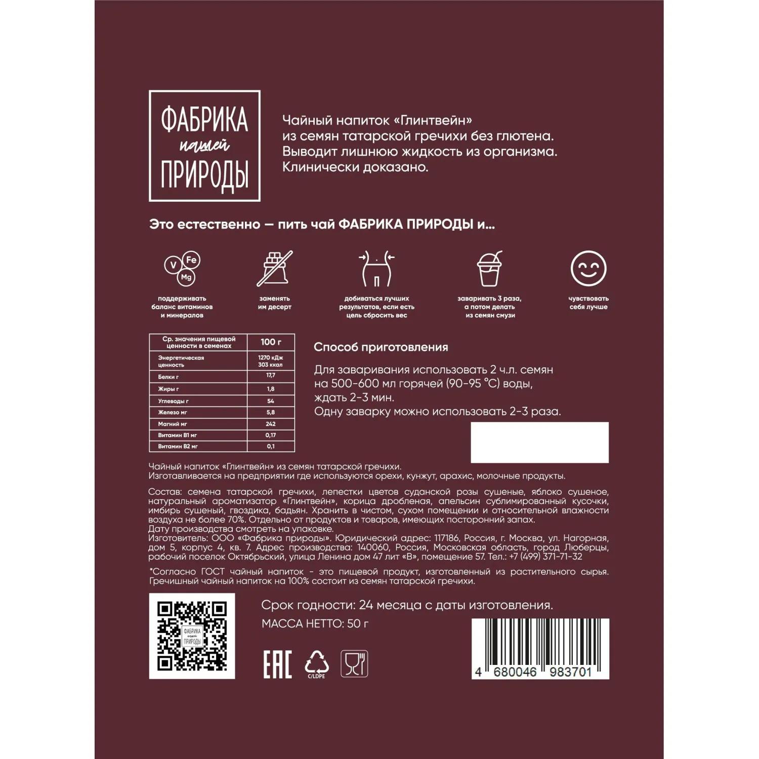 Чайный напиток Глинтвейн из семян татарской гречихи. Традиционный терпкий вкус глинтвейна дополняют бисквитные ноты гречихи. <br><b>Состав:</b> семена татарской гречихи, лепестки цветов суданской розы сушёные, яблоко сушёное, натуральный ароматизатор «Глинтвейн», корица дроблёная, апельсин сублимированный кусочки, имбирь сушёный, гвоздика, бадьян. <br><b>Способ приготовления:</b> для заваривания использовать 2 ч.л. семян на 500-600 мл горячей воды (90-95 °С), ждать 2-3 минуты. Одну заварку можно использовать 2-3 раза.<br><b>Вес:</b> 50 г.<br><b>Тип упаковки:</b> пакет.<br><b>Условия хранения:</b> хранить в чистом, сухом помещении при относительной влажности не более 70% отдельно от продуктов и товаров, имеющих посторонний запах. <br><b>Страна производства:</b> Россия.