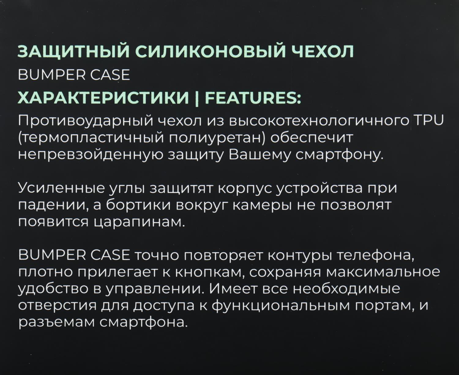 | Описание | Прозрачный противоударный силиконовый чехол Bumper Case c усиленными углами и защитным бортом надёжно защитит корпус Вашего устройства от царапин, грязи и механических повреждений. Имеет все необходимые отверстия для доступа к функциональным портам и разъемам. |