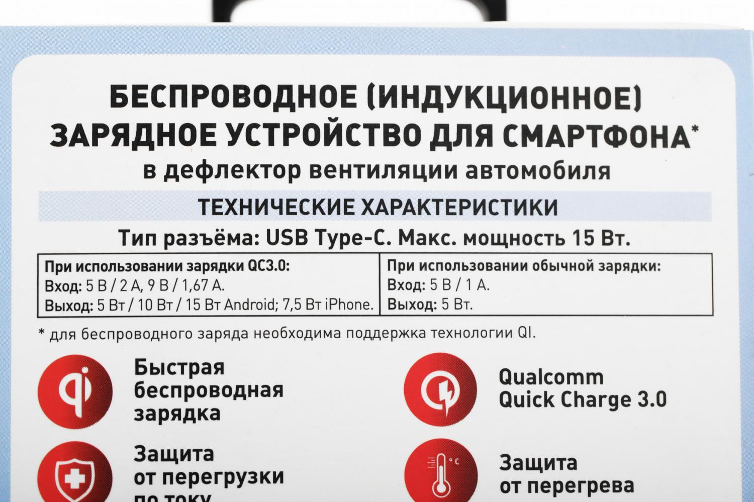 Описание Беспроводное (индукционное) зарядное устройство для смартфона, в дефлектор вентиляции автомобиля.В комплекте: держатель с функцией беспроводной зарядки (БЗУ), металлическое кольцо, крепление в дефлектор вентиляции автомобиля, кабель Type-C, инструкция. Максимальная мощность: 15 Вт.