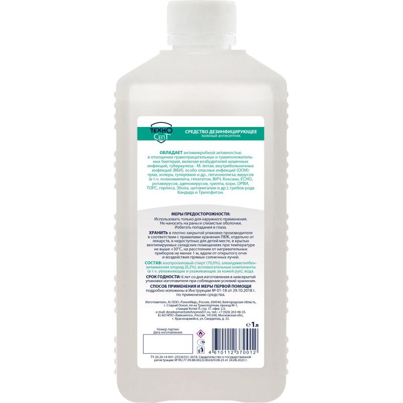 Дезинфицирующее средство Техносепт предназначено для дезинфекции, мойки и дезодорирования различных поверхностей и объектов. Оно используется для дезинфекции медицинских отходов, выделений, биологических жидкостей, остатков пищи, а также для предстерилизационной очистки эндоскопов, инструментов, кувезов, стоматологических оттисков и зубопротезных заготовок. Средство также применяется для дезинфекции и мытья посуды, инвентаря, белья, игрушек, спортивного инвентаря и других объектов, в том числе в медицинских и лечебно-профилактических учреждениях.<br><br>Средство обладает тройным синергетическим действием: дезинфицирующим, моющим и дезодорирующим. Оно эффективно нейтрализует неприятные запахи, включая запахи мочи, гнилостные запахи, запах плесени, а также посторонние запахи в помещениях с лежачими больными. Средство не повреждает обрабатываемые объекты, не вызывает коррозии на различных материалах, таких как нержавеющая сталь, алюминиевые сплавы, стекло, пластик, резины, лакированные и хромированные покрытия.<br><br>Средство подходит для использования в медицинских учреждениях, стоматологических клиниках, учреждениях образования, в сфере общественного питания и на других объектах с высоким уровнем санитарно-гигиенических требований. Оно также применяется для дезинфекции и очистки в общественных туалетах, аквапарках, бассейнах, а также на объектах массового скопления людей.<br><br>Состав средства включает алкилдиметилбензиламмоний хлорид (ЧАС) 5%, неионогенные ПАВ 15%, изопропанол 2% и другие функциональные компоненты. Растворы средства обладают хорошими моющими свойствами и сохраняют эффективность после замерзания.<br><br>Средство соответствует стандартам ТУ 20.20.14-001-25530101-2018. Время действия дезинфекции не указано.<br><br>Внешний вид и/или характеристики товара могут быть изменены производителем в соответствии с производственным процессом.