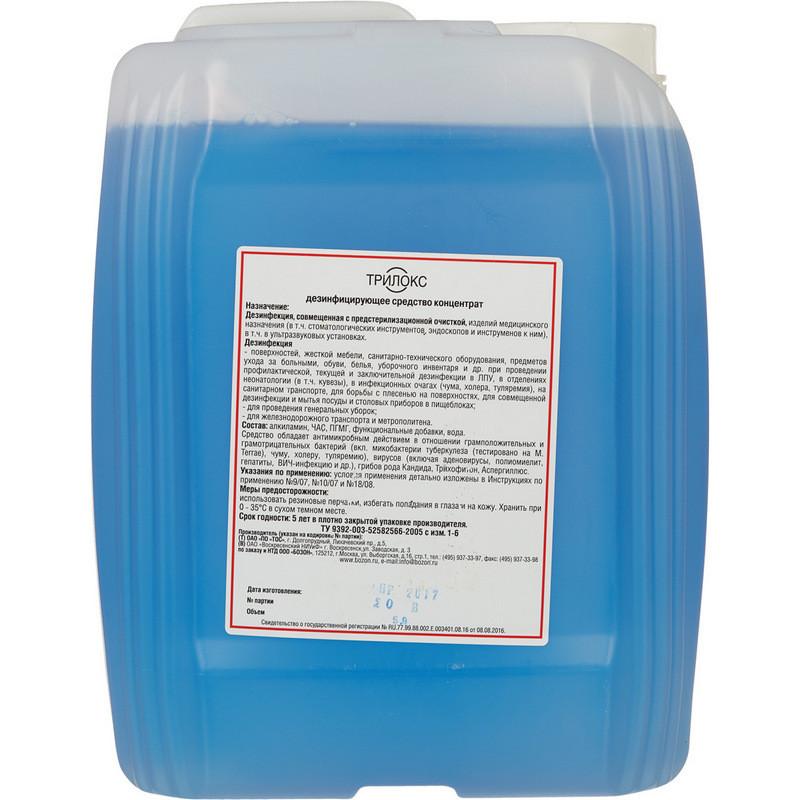 Дезинфицирующее средство Трилокс эффективно используется для дезинфекции в медицинских учреждениях, детских учреждениях, клинических лабораториях, инфекционных очагах и других объектах с высокими требованиями к стерильности. Оно применяется для обработки белья, медицинского оборудования, игрушек, инвентаря, а также различных поверхностей и воздуховодов.<br><br>Основными активными компонентами средства являются N,N-бис(3-аминопропил)додециламин (3.8%), алкилдиметилбензиламмоний хлорид (АДБАХ) (3.8%) и полигексаметиленгуанидин гидрохлорид (ПГМГ) (7.5%), что обуславливает его эффективность против бактерий, вирусов, грибков и возбудителей особо опасных инфекций. Оно активно против Mycobacterium tuberculosis, вирусов ВИЧ, гриппа, энтеровирусов и других инфекций, а также патогенных грибов, таких как дерматофитон и кандида.<br><br>Средство используется для дезинфекции различных объектов, включая медицинские инструменты, белье, мебель, а также оборудование в больницах, детских учреждениях, лабораториях и других местах. Время действия дезинфекции варьируется от 5 до 120 минут в зависимости от типа обработки и концентрации раствора.<br><br>Средство имеет класс опасности 3 при введении в желудок, 4 при нанесении на кожу и для рабочего раствора. Оно не требует нейтрализации и сохраняет свою эффективность в упаковке в течение 3 лет, а в рабочем растворе — 14 дней.<br><br>Внешний вид и/или характеристики товара могут быть изменены производителем в соответствии с производственным процессом.