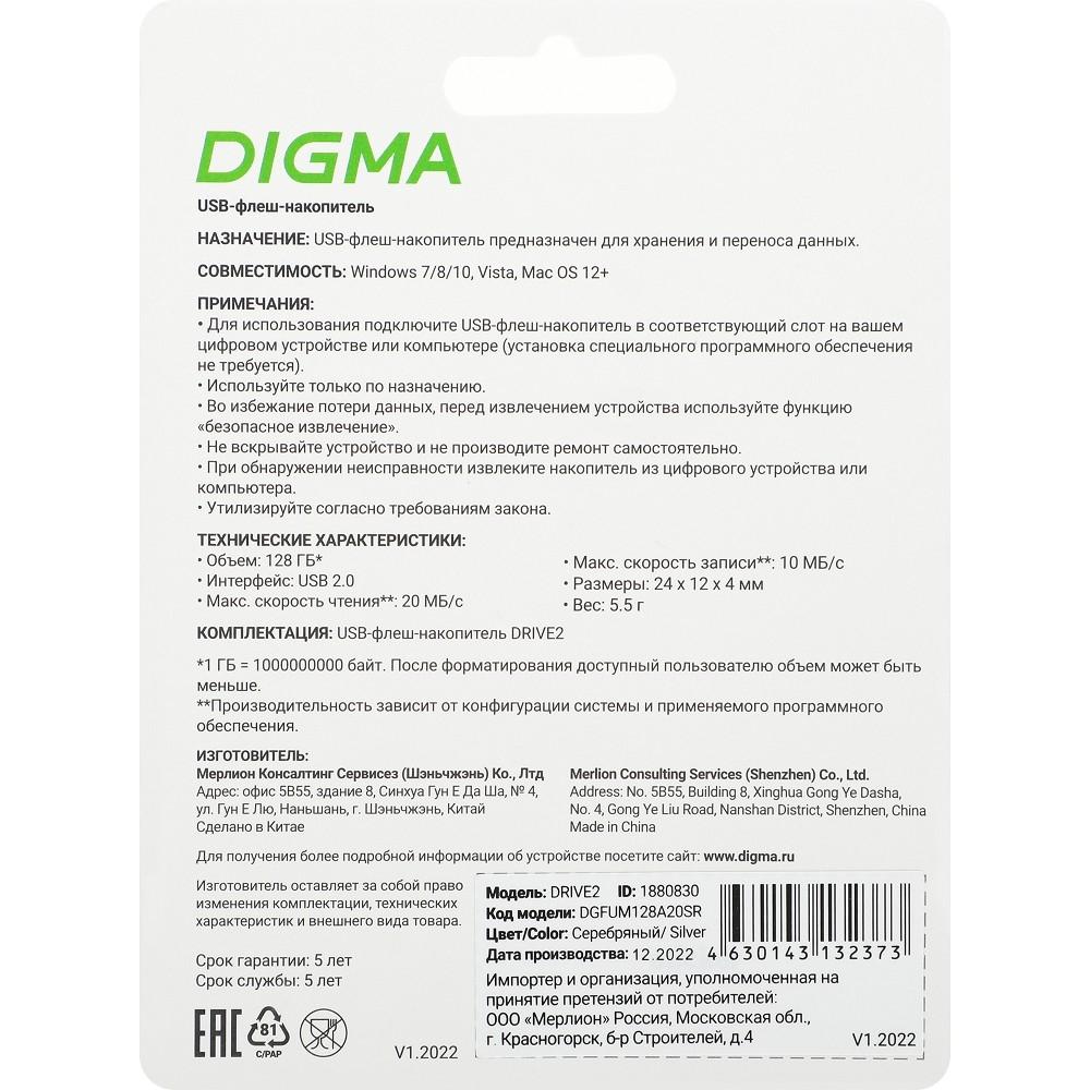 | описание | USB накопитель DRIVE2 (DGFUM128A20SR) от Digma |