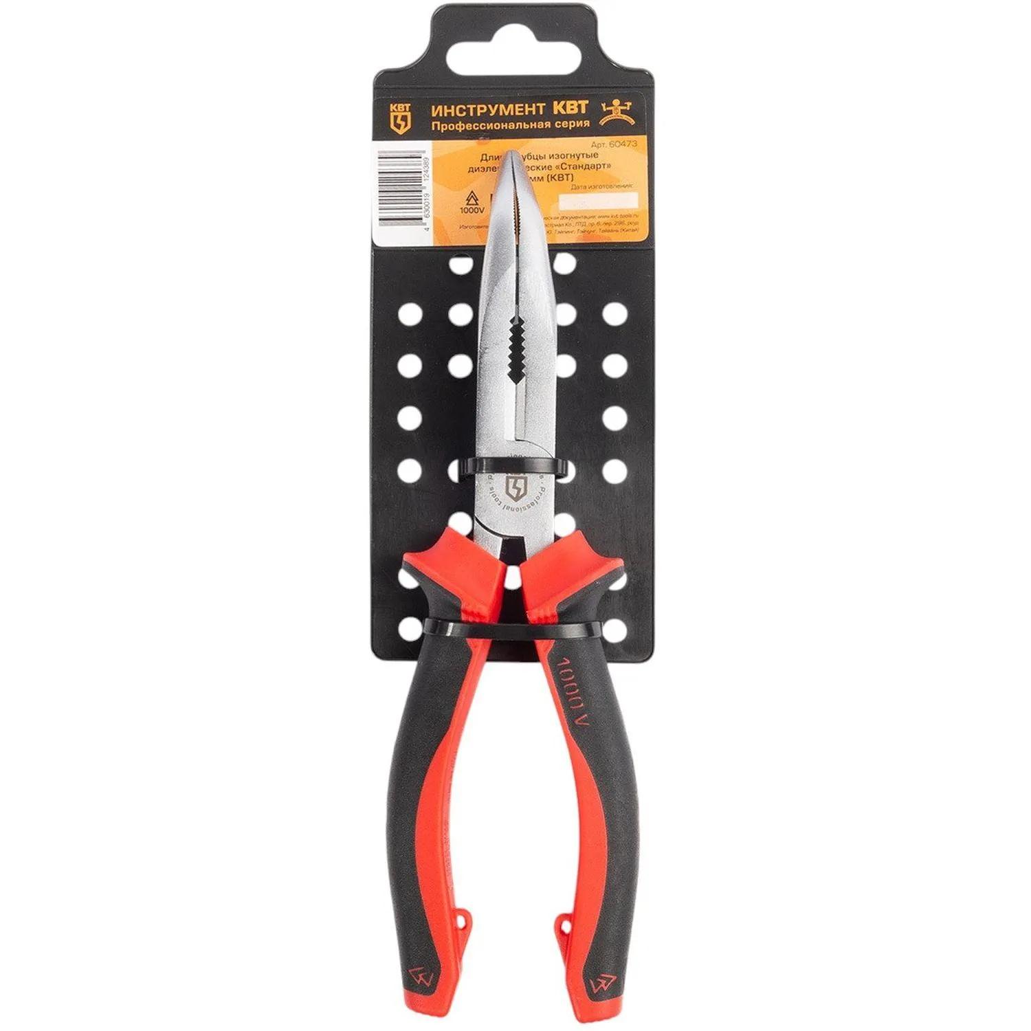 Длинногубцы изогнутые диэлектрические КВТ Стандарт 200 мм (60473)<br><br>Особенности:<br>— Для работ под напряжением до 1000 В<br>— Зоны захвата для плоских и круглых деталей<br>— Угол изгиба захватных губок: 40°<br>— Режущие кромки дополнительно закалены токами высокой частоты. HRC 58-62<br>— Резка твёрдой стальной проволоки ∅ до 1.5 мм<br>— Резка провода Ø до 6 мм<br>— Материал рабочей части: хром-ванадиевая сталь<br>— Обработка поверхности: матовое никелирование<br>— Двухцветные многокомпонентные рукоятки с упорами для защиты от соскальзывания<br><br>Вес инструмента: 210 г<br>Длина инструмента: 200 мм<br><br>Внешний вид и/или характеристики товара могут быть изменены производителем в соответствии с производственным процессом.