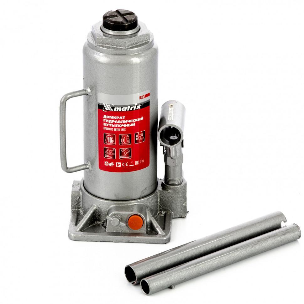 Домкрат гидравлический бутылочный Matrix 10 тонн 230-460 мм (50767)<br><br>Гидравлический бутылочный домкрат Matrix 50767 предназначен для быстрого поднятия грузов массой до 10 т на высоту 230-460 мм. Будет полезен автолюбителям и мастерам СТО в качестве полупрофессионального инструмента. Встроенный магнитный уловитель металлической стружки защищает резиновые уплотнители от повреждений.<br><br>Преимущества<br>— Защита от перегрузки — клапан безопасности не допускает поднятия груза массой более 10 т.<br>— Надёжность — подъёмное устройство выполнено из прочной коррозионностойкой стали.<br>— Разборный корпус — домкрат можно отремонтировать при необходимости.<br>— Удобная транспортировка — домкрат весом 6,25 кг легко помещается в багажник авто. <br><br>Внешний вид и/или характеристики товара могут быть изменены производителем в соответствии с производственным процессом.