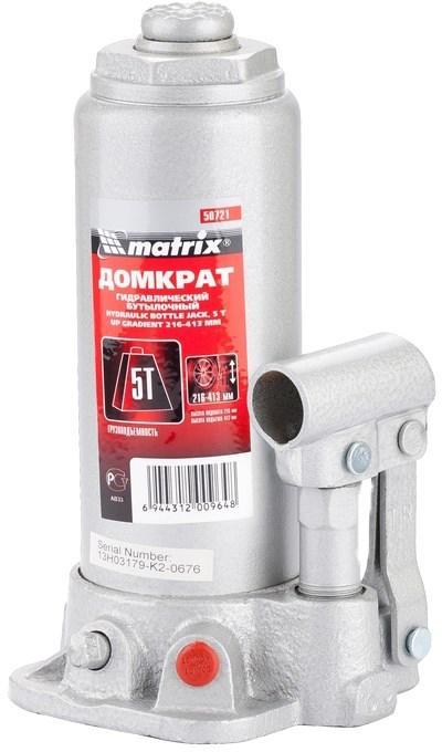 Домкрат гидравлический бутылочный Matrix 5 тонн 216-413 мм (50721)<br><br>Домкрат гидравлический бутылочный Matrix 50721 используется для поднятия грузов массой до 5 т на высоту 216-413 мм. Подходит для автомобилей с высоким клиренсом. Домкрат будет полезен автолюбителям в гараже и дороге, а также сотрудникам СТО.<br><br>Преимущества<br>— Защита от перегрузок — клапан безопасности предотвращает подъем груза массой более 5000 кг.<br>— Широкий диапазон применения — усиленный винт позволяет вручную увеличить высоту подъёма на 60 мм.<br>— Надёжная конструкция — домкрат имеет устойчивое чугунное основание, корпус из высокопрочной стали, а также полированный шток, увеличивающий срок службы.<br>— Устойчивость к износу — благодаря трапециевидной резьбе увеличительный винт выдерживает многократное использование.<br>— Ремонтопригодность — при необходимости корпус можно снять со станины.<br>— Защита от коррозии — на корпус нанесено фосфатное покрытие.<br>— Высококачественное всесезонное масло — домкрат безотказно работает в широком диапазоне температур (от −20 до 45 ).<br>— Простое обслуживание — заменить масло можно самостоятельно, сняв пробку заливного отверстия.<br>— Эффективность — чугунная станина обеспечивает устойчивое положение домкрата, составная рукоятка позволяет проводить работы в ограниченном пространстве и компактно размещать устройство в зоне хранения.<br>— Малый вес 4,6 кг — домкрат легко транспортировать в одиночку. <br><br>Внешний вид и/или характеристики товара могут быть изменены производителем в соответствии с производственным процессом.