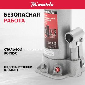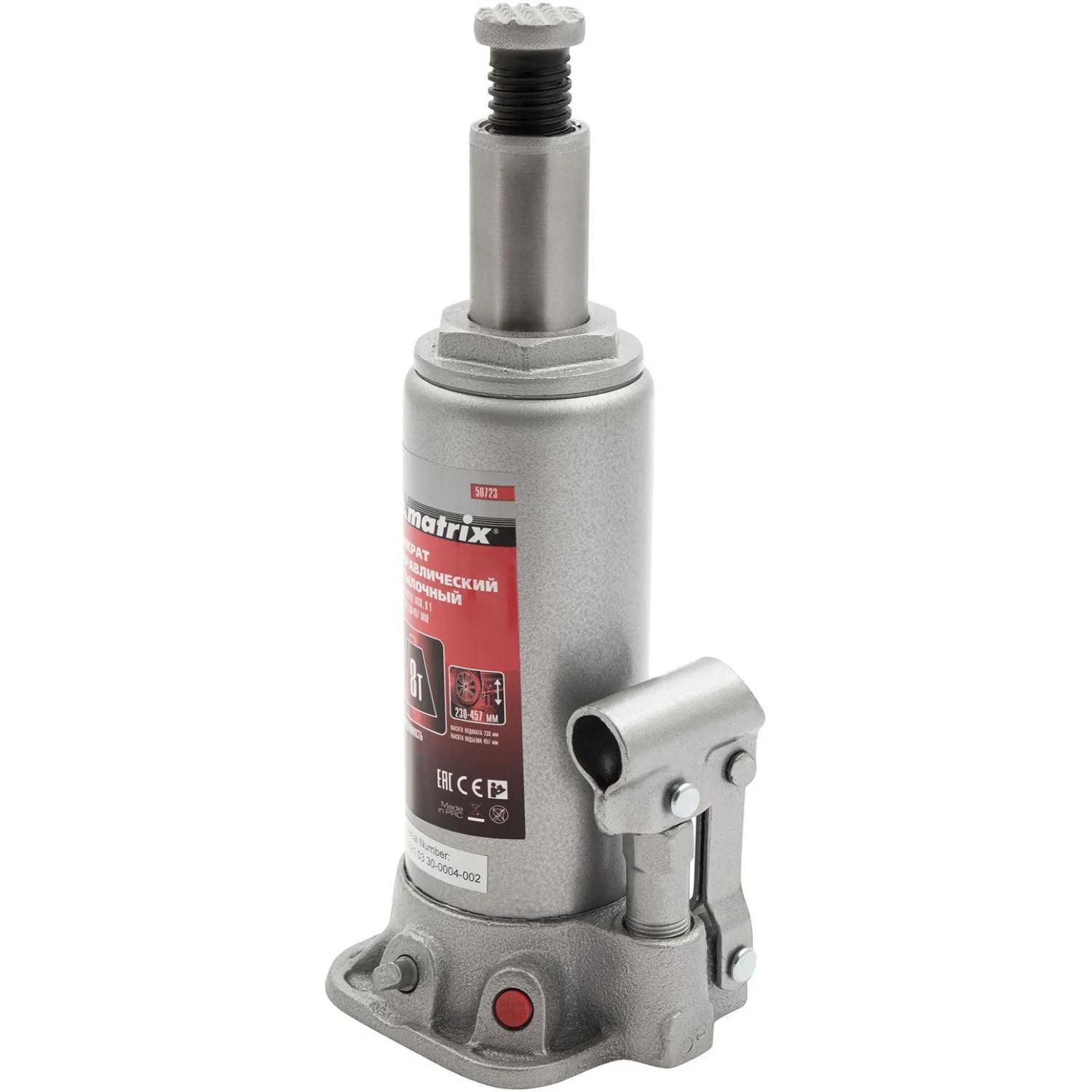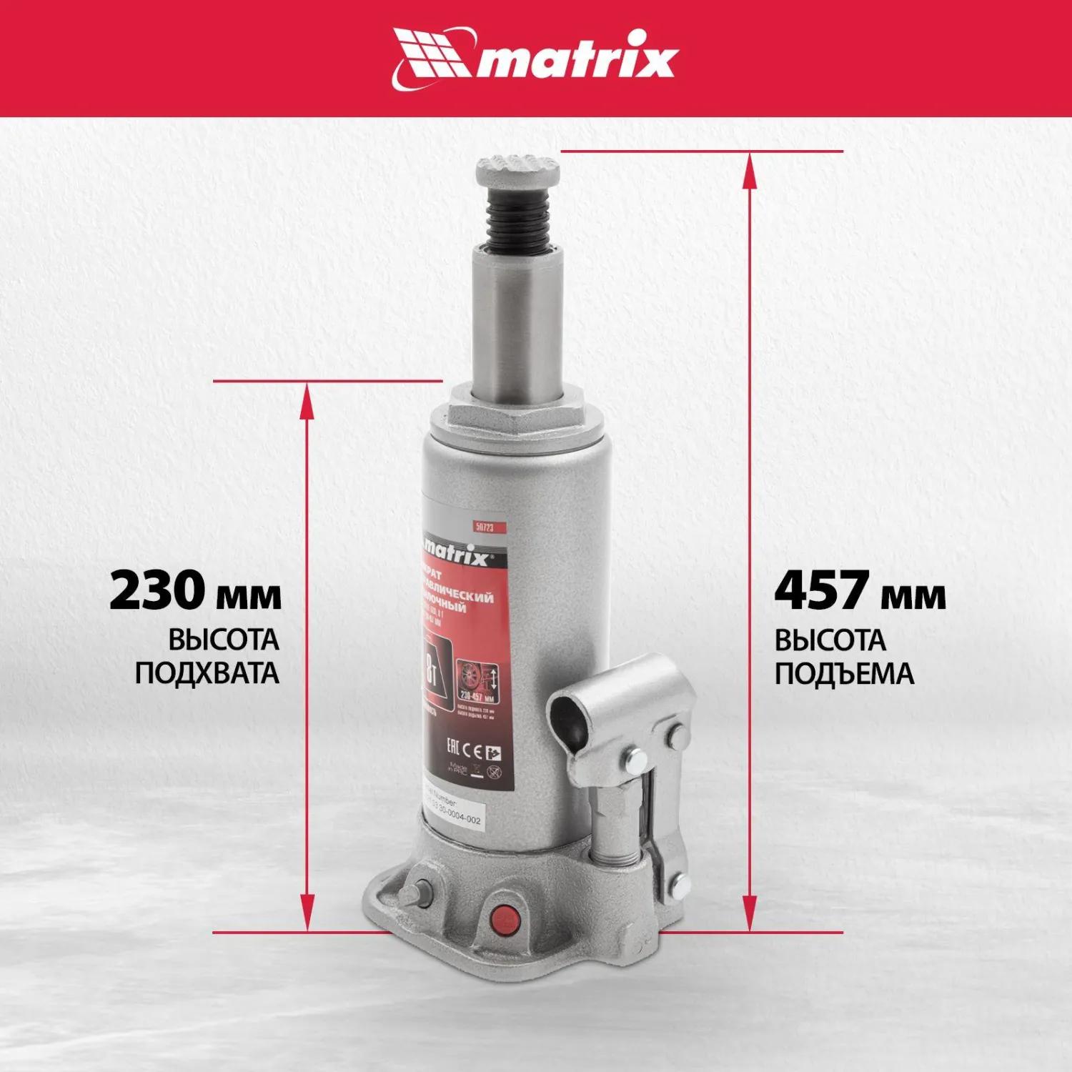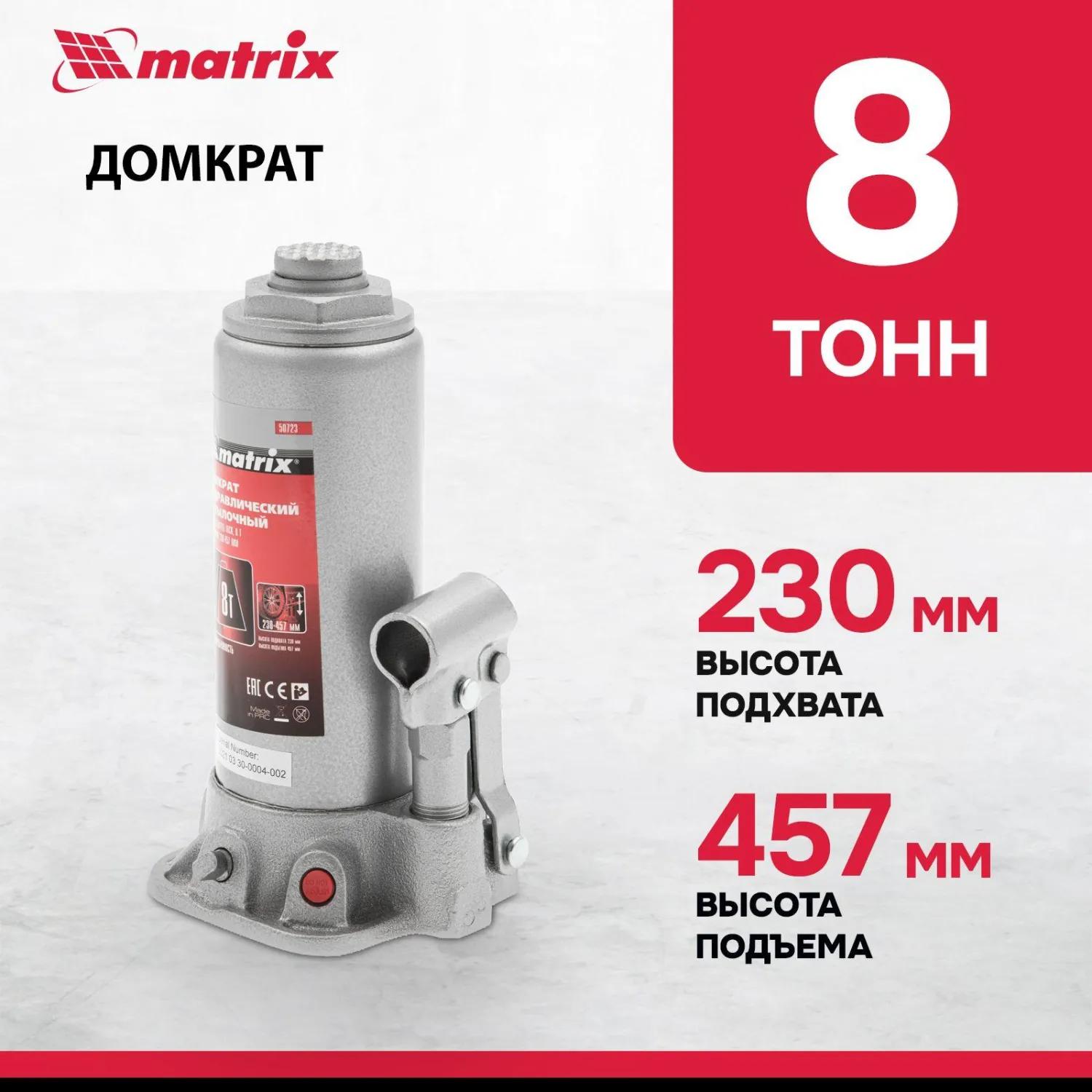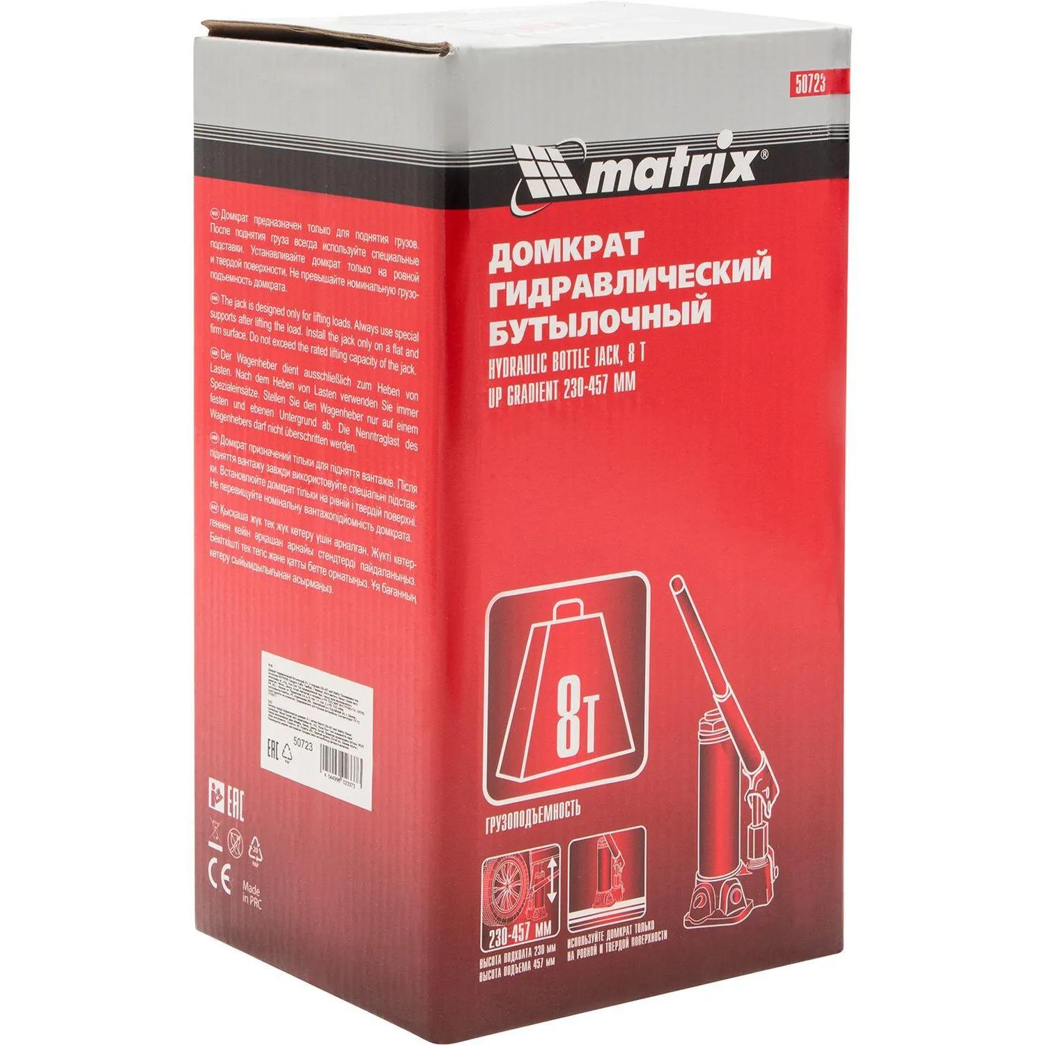 Домкрат гидравлический бутылочный Matrix 8 тонн 230-457 мм (50723)<br><br>Домкрат гидравлический бутылочный Matrix 50723 используется для поднятия грузов массой до 8 т на высоту 230-457 мм. Подходит для автомобилей с высоким клиренсом. Домкрат будет полезен автолюбителям в гараже и дороге, а также сотрудникам СТО.<br><br>Преимущества<br>— Защита от перегрузок — клапан безопасности предотвращает подъем груза массой более 8000 кг.<br>— Широкий диапазон применения — усиленный винт позволяет вручную увеличить высоту подъёма на 60 мм.<br>— Надёжная конструкция — домкрат имеет устойчивое чугунное основание, корпус из высокопрочной стали, а также полированный шток, увеличивающий срок службы.<br>— Устойчивость к износу — благодаря трапециевидной резьбе увеличительный винт выдерживает многократное использование.<br>— Ремонтопригодность — при необходимости корпус можно снять со станины.<br>— Защита от коррозии — на корпус нанесено фосфатное покрытие.<br>— Высококачественное всесезонное масло — домкрат безотказно работает в широком диапазоне температур (от −20 до 45 ).<br>— Простое обслуживание — заменить масло можно самостоятельно, сняв пробку заливного отверстия.<br>— Эффективность — чугунная станина обеспечивает устойчивое положение домкрата, составная рукоятка позволяет проводить работы в ограниченном пространстве и компактно размещать устройство в зоне хранения. <br><br>Внешний вид и/или характеристики товара могут быть изменены производителем в соответствии с производственным процессом.