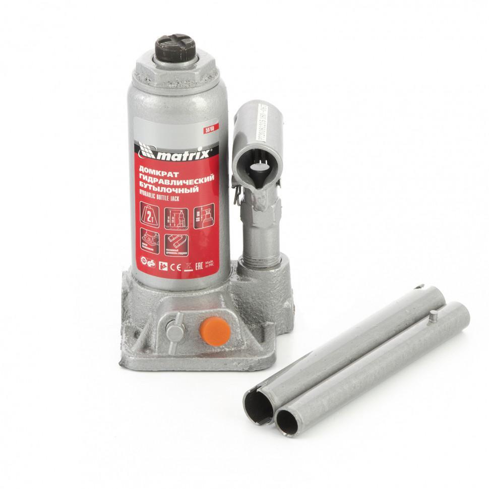 Домкрат гидравлический бутылочный Matrix 2 тонны158-308 мм (50760)<br><br>Гидравлический бутылочный домкрат Matrix 50760 предназначен для быстрого поднятия грузов массой до 2 т на высоту 158-308 мм. Будет полезен автолюбителям и мастерам СТО в качестве полупрофессионального инструмента. Встроенный магнитный уловитель металлической стружки защищает резиновые уплотнители от повреждений.<br><br>Преимущества<br>• Защита от перегрузки — клапан безопасности не допускает поднятия груза массой более 2000 кг.<br>• Надёжность — подъёмное устройство выполнено из прочной коррозионностойкой стали.<br>• Разборный корпус — домкрат можно отремонтировать при необходимости.<br>• Удобная транспортировка — домкрат весом 2,3 кг легко помещается в багажник авто.<br><br>Внешний вид и/или характеристики товара могут быть изменены производителем в соответствии с производственным процессом.