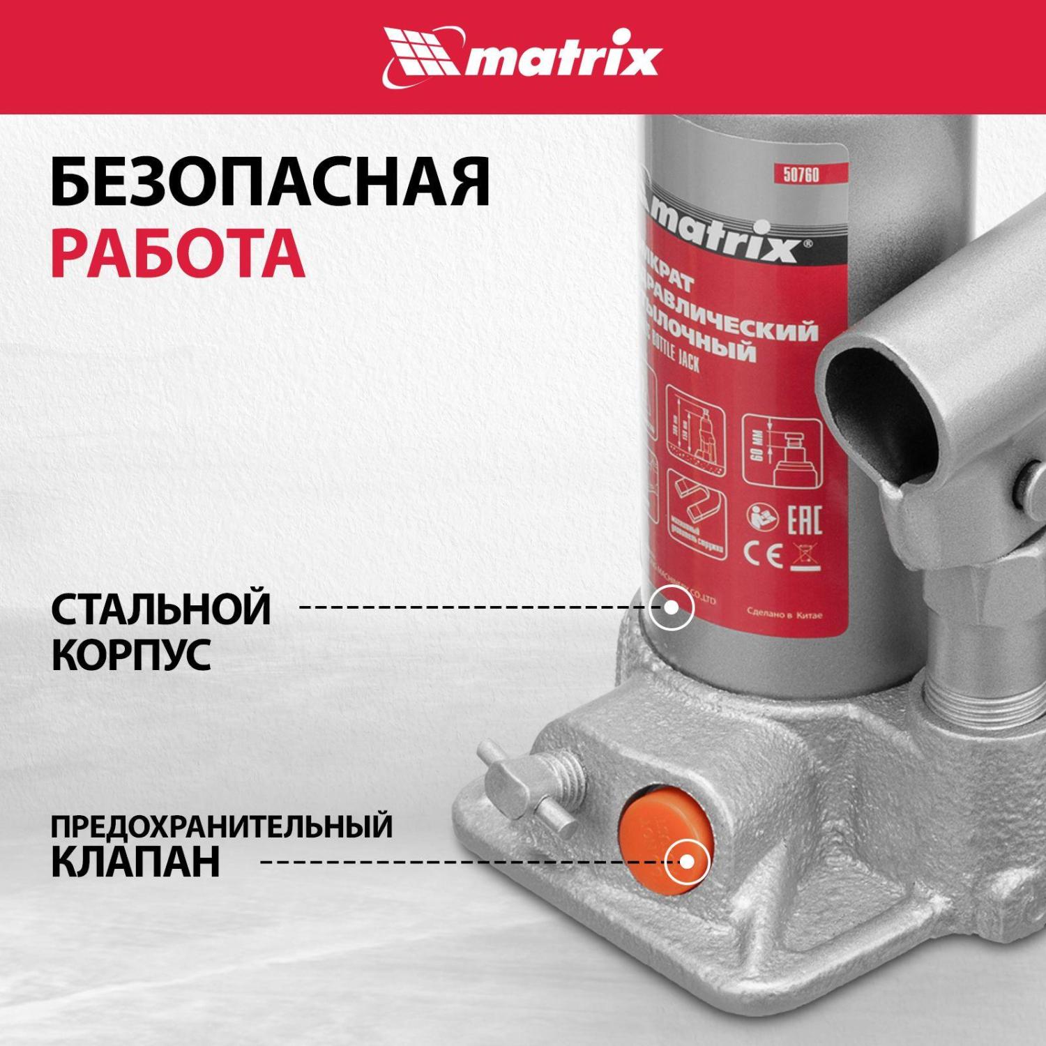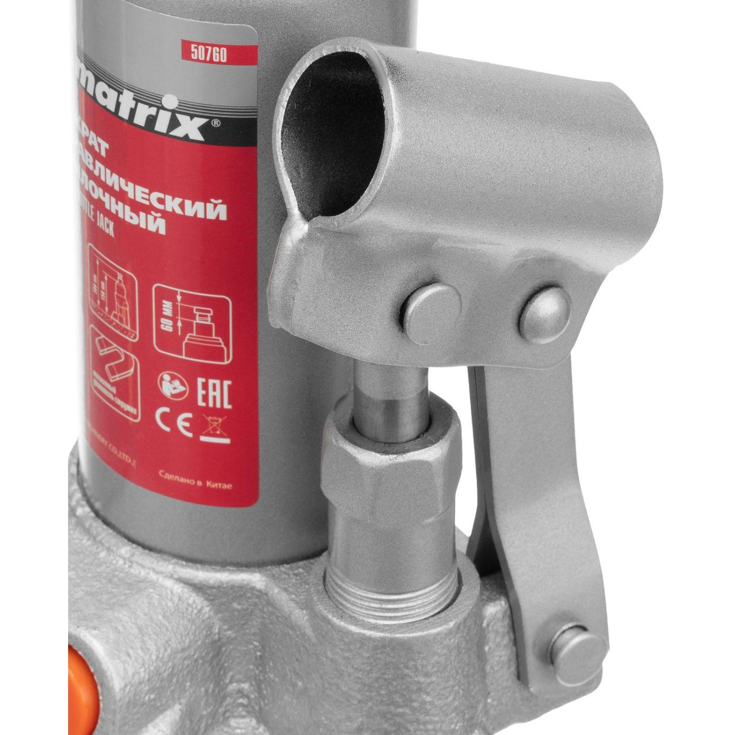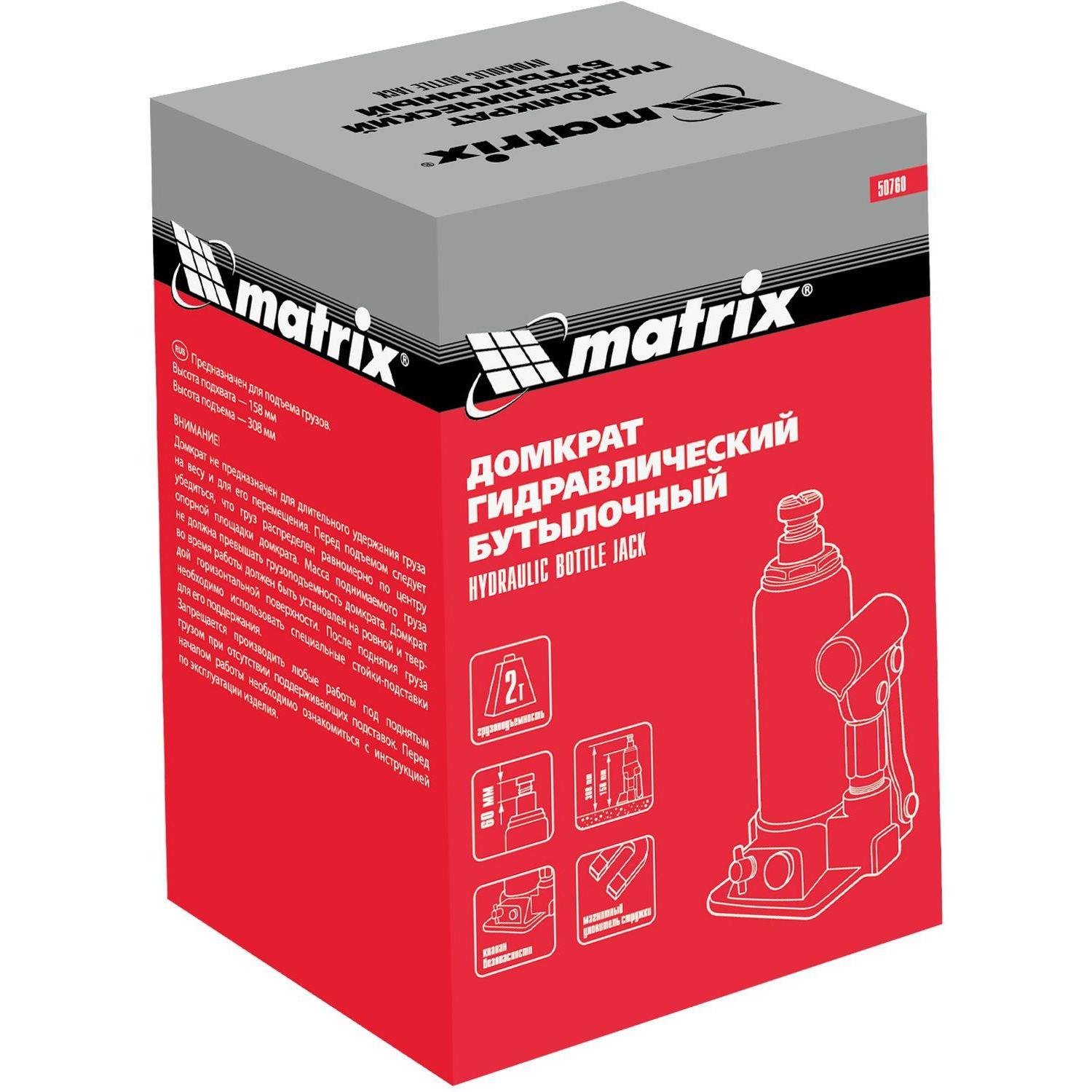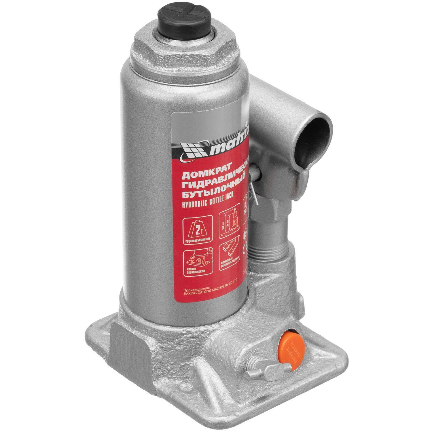 Домкрат гидравлический бутылочный Matrix 2 тонны158-308 мм (50760)<br><br>Гидравлический бутылочный домкрат Matrix 50760 предназначен для быстрого поднятия грузов массой до 2 т на высоту 158-308 мм. Будет полезен автолюбителям и мастерам СТО в качестве полупрофессионального инструмента. Встроенный магнитный уловитель металлической стружки защищает резиновые уплотнители от повреждений.<br><br>Преимущества<br>• Защита от перегрузки — клапан безопасности не допускает поднятия груза массой более 2000 кг.<br>• Надёжность — подъёмное устройство выполнено из прочной коррозионностойкой стали.<br>• Разборный корпус — домкрат можно отремонтировать при необходимости.<br>• Удобная транспортировка — домкрат весом 2,3 кг легко помещается в багажник авто.<br><br>Внешний вид и/или характеристики товара могут быть изменены производителем в соответствии с производственным процессом.