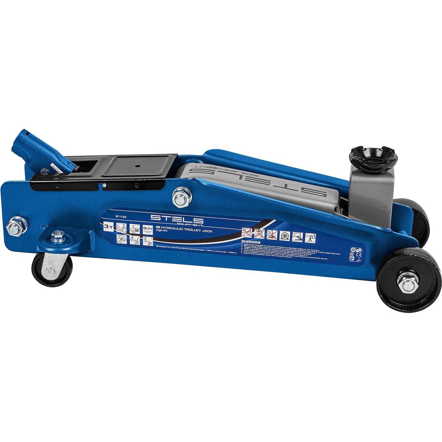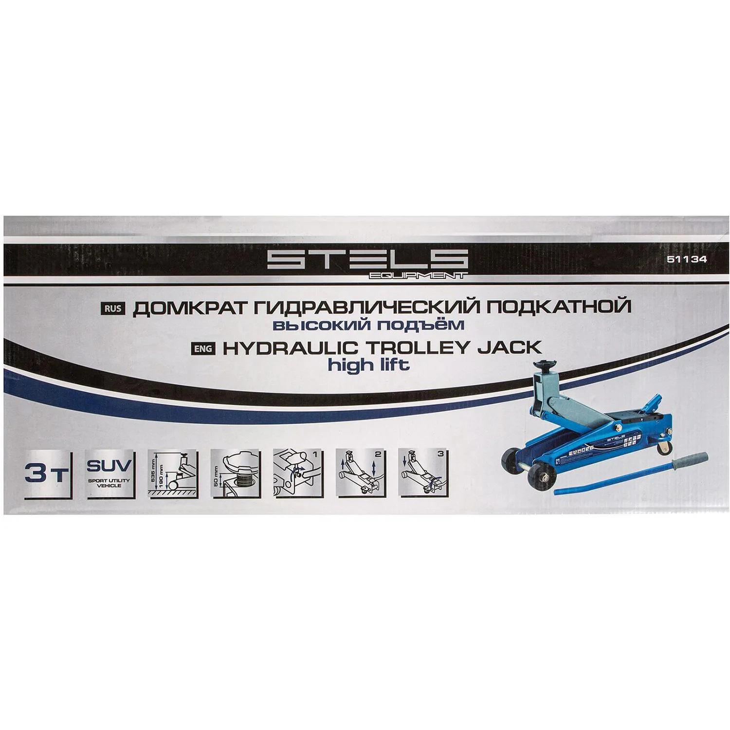 Домкрат гидравлический подкатной Stels 3 тонн 190-535 мм (51134)<br><br>Подкатной гидравлический домкрат Stels 51134 с высоким подъёмом 190 мм позволяет поднимать грузы весом до 3 т на высоту 535 мм и подходит для автомобилей класса SUV с увеличенным дорожным просветом. Может использоваться для самостоятельного обслуживания авто.<br><br>Преимущества<br>— Установка точной высоты подъёма — положение опорной площадки регулируется в пределах 50 мм.<br>— Защита от перегрузки — предохранительный клапан не допускает подъем груза массой более 3 т.<br>— Манёвренность — задние колёса сделаны поворотными, что облегчает установку и извлечение устройства.<br>— Комфортная работа даже при отрицательной температуре — благодаря рифлёной накладке рабочая ручка не скользит в ладони.<br><br>Внешний вид и/или характеристики товара могут быть изменены производителем в соответствии с производственным процессом.