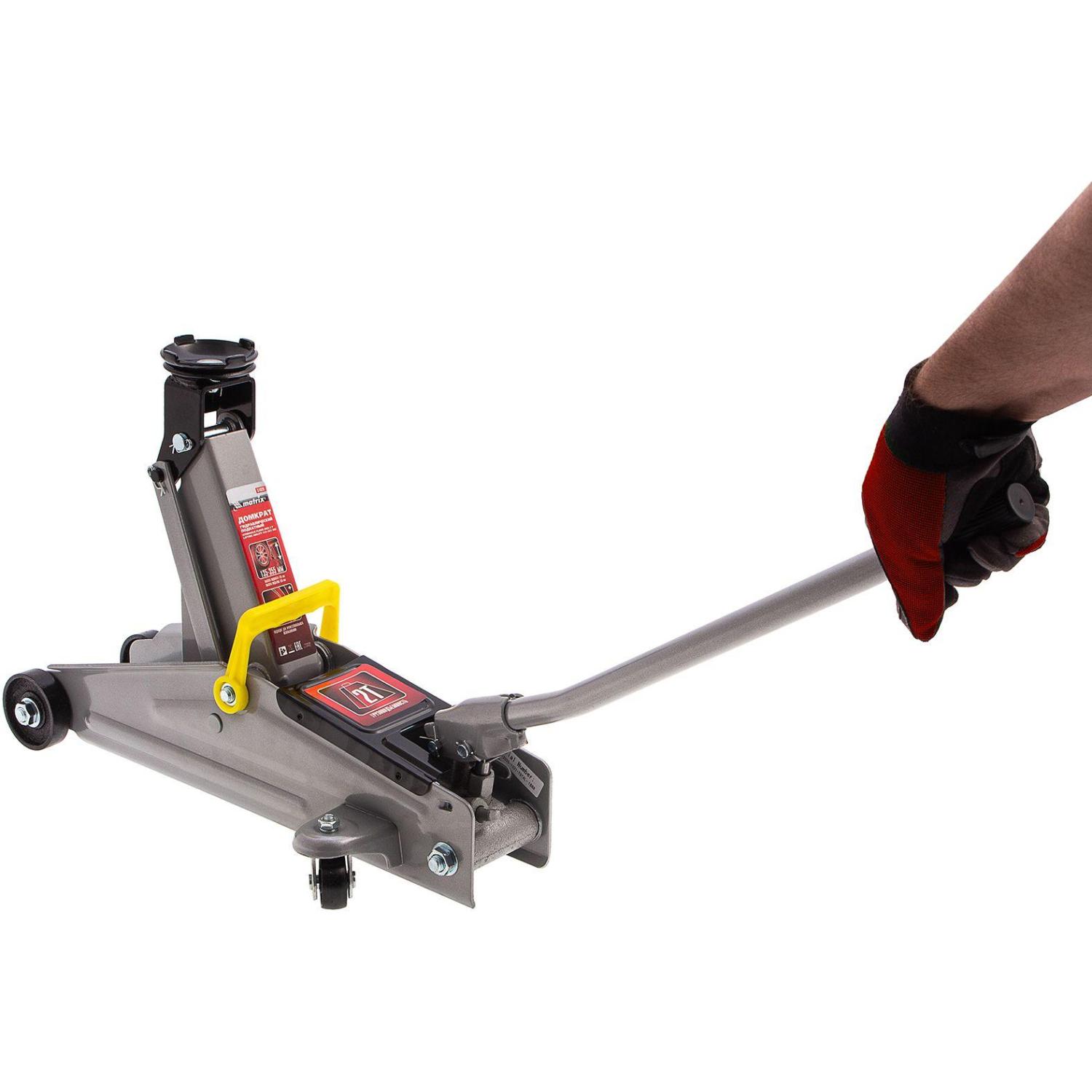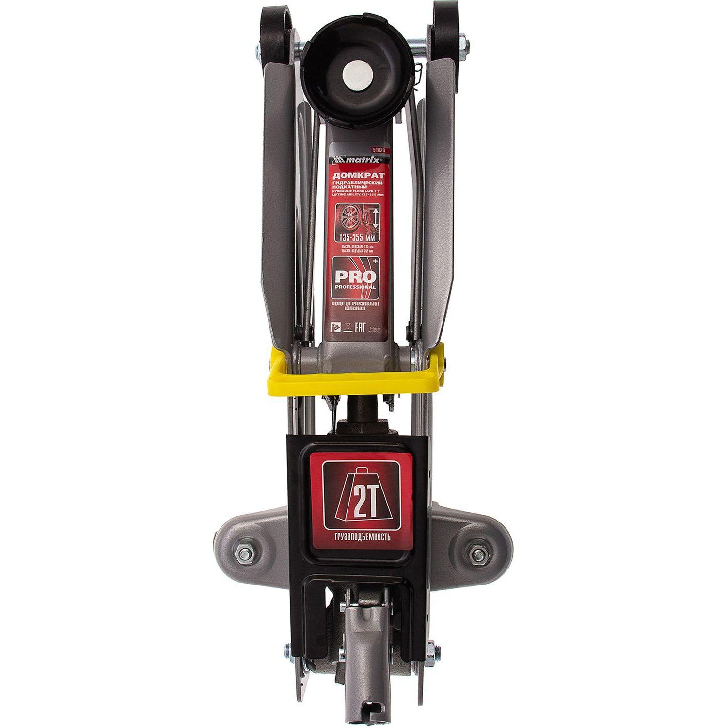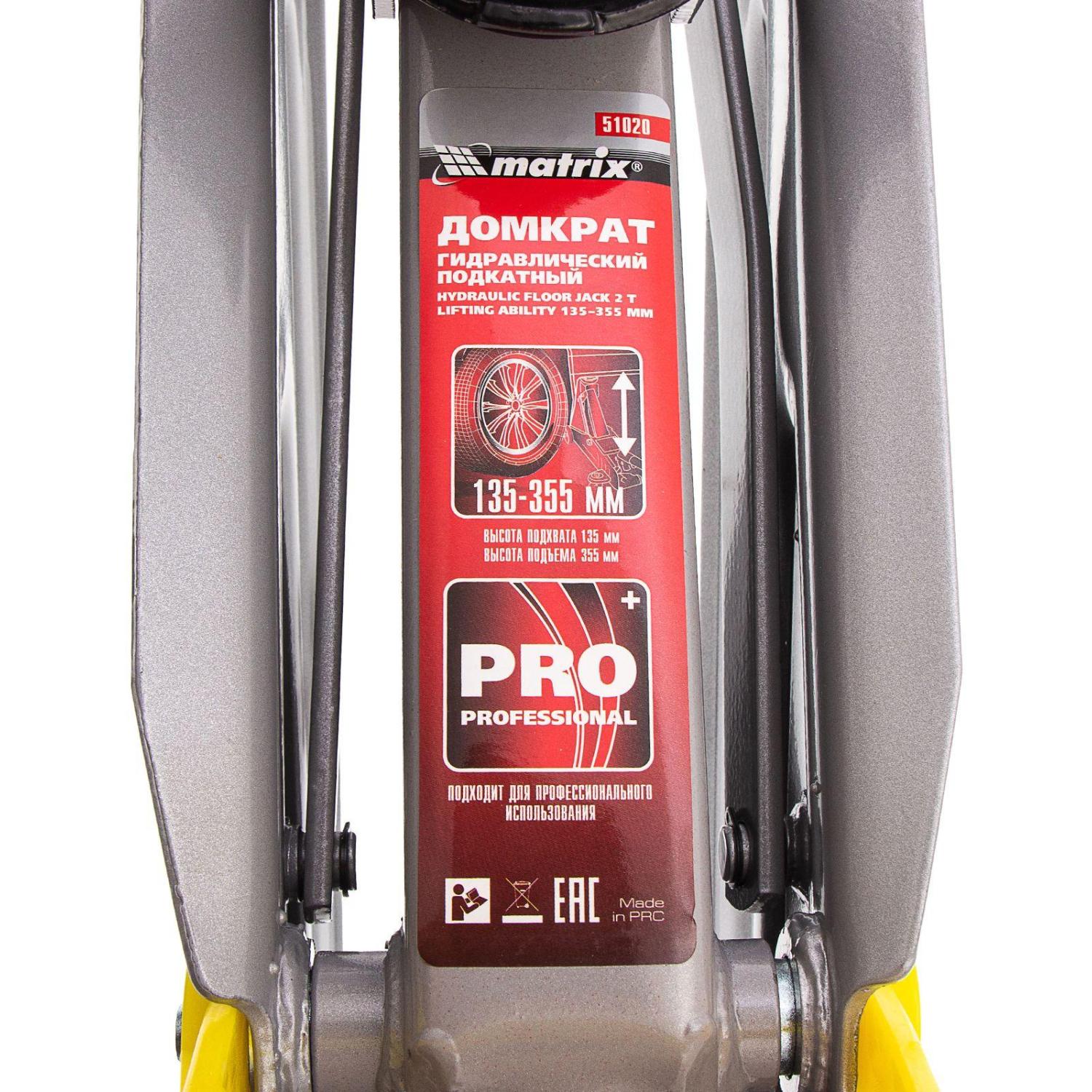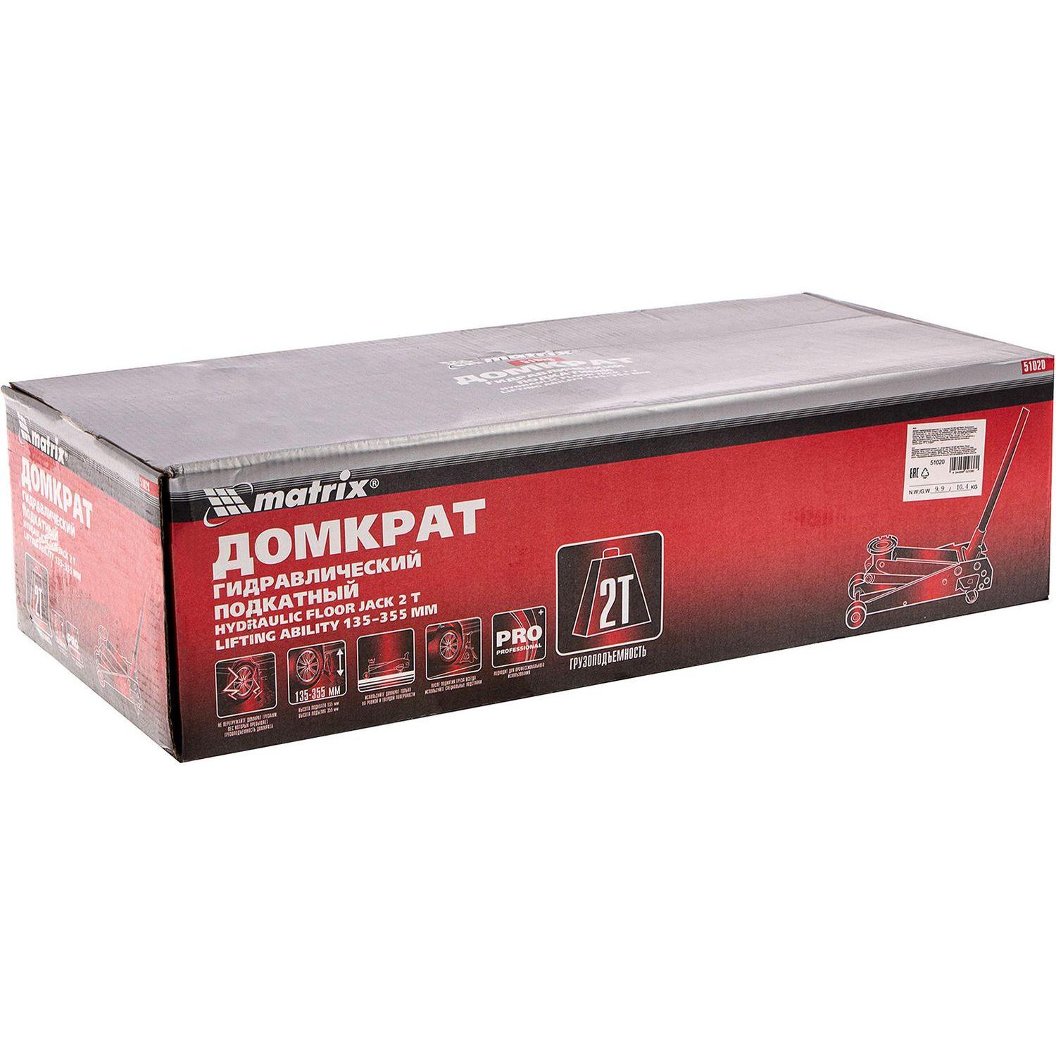 Домкрат гидравлический подкатной Matrix 2 тонны 135-355 мм (51020)<br><br>Подкатной гидравлический домкрат Matrix 51020 с высотой подхвата 135 мм — полупрофессиональное гаражное оборудование, способное поднимать груз массой до 2 т на высоту до 355 мм. Высота подхвата 135 мм позволяет использовать домкрат для автомашин со стандартным клиренсом. Домкрат будет полезен как в автомастерской, так и в частном гараже.<br><br>Преимущества<br>• Надёжность — усиленная конструкция выдерживает интенсивное использование.<br>• Коррозионная стойкость — на инструмент нанесено защитное покрытие.<br>• Безопасная эксплуатация — предохранительный клапан препятствует подъёму груза массой более 2 т, предотвращая поломку домкрата.<br>• Мобильность — благодаря транспортировочной ручке домкрат удобно перемещать по рабочей зоне.<br>• Компактность — домкрат размером 492×215×135 мм легко помещается в багажник автомобиля.<br><br>Внешний вид и/или характеристики товара могут быть изменены производителем в соответствии с производственным процессом.