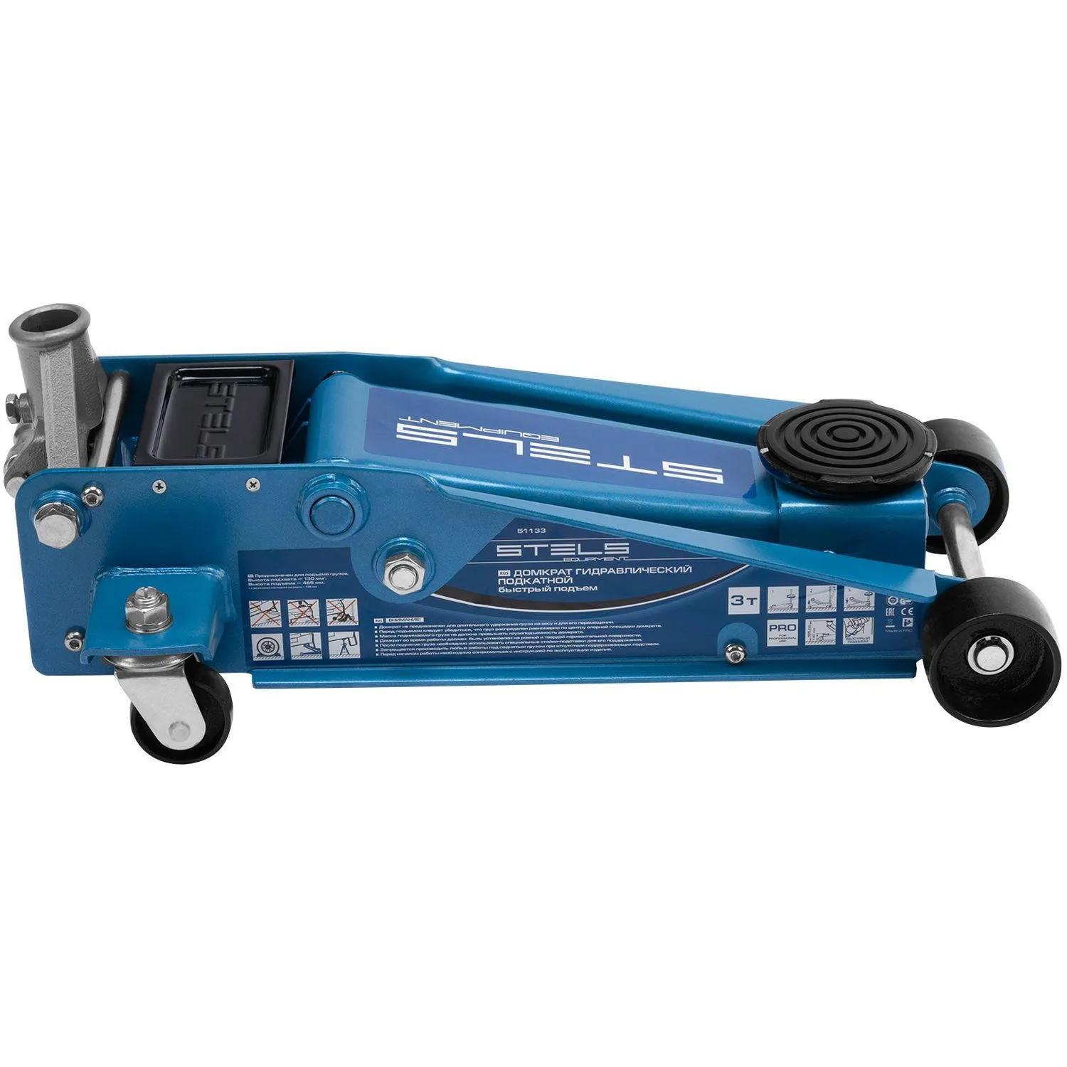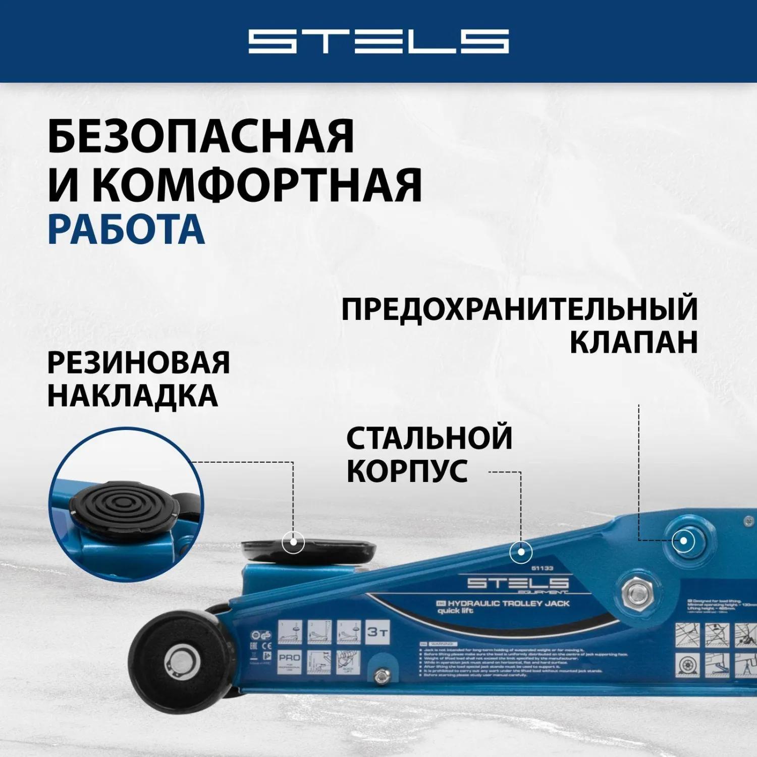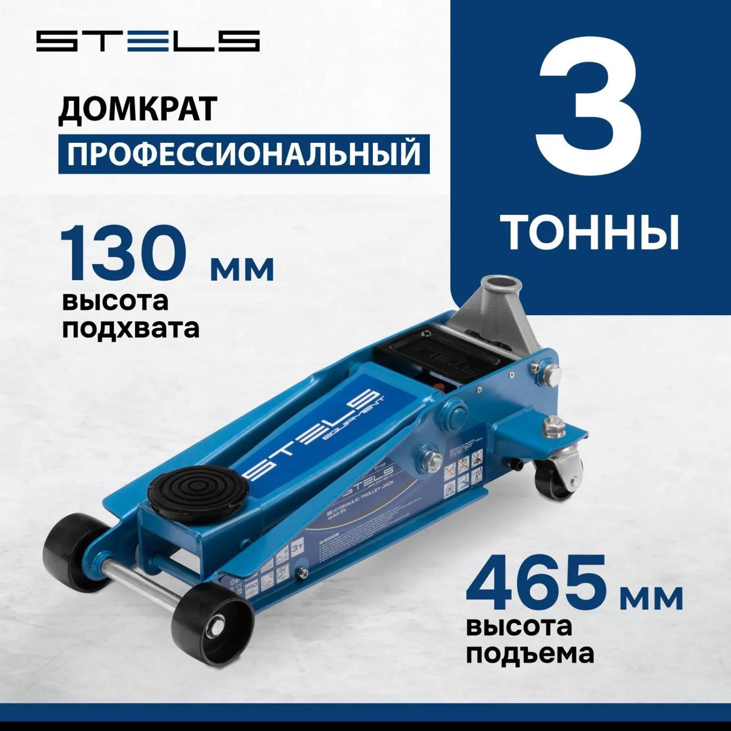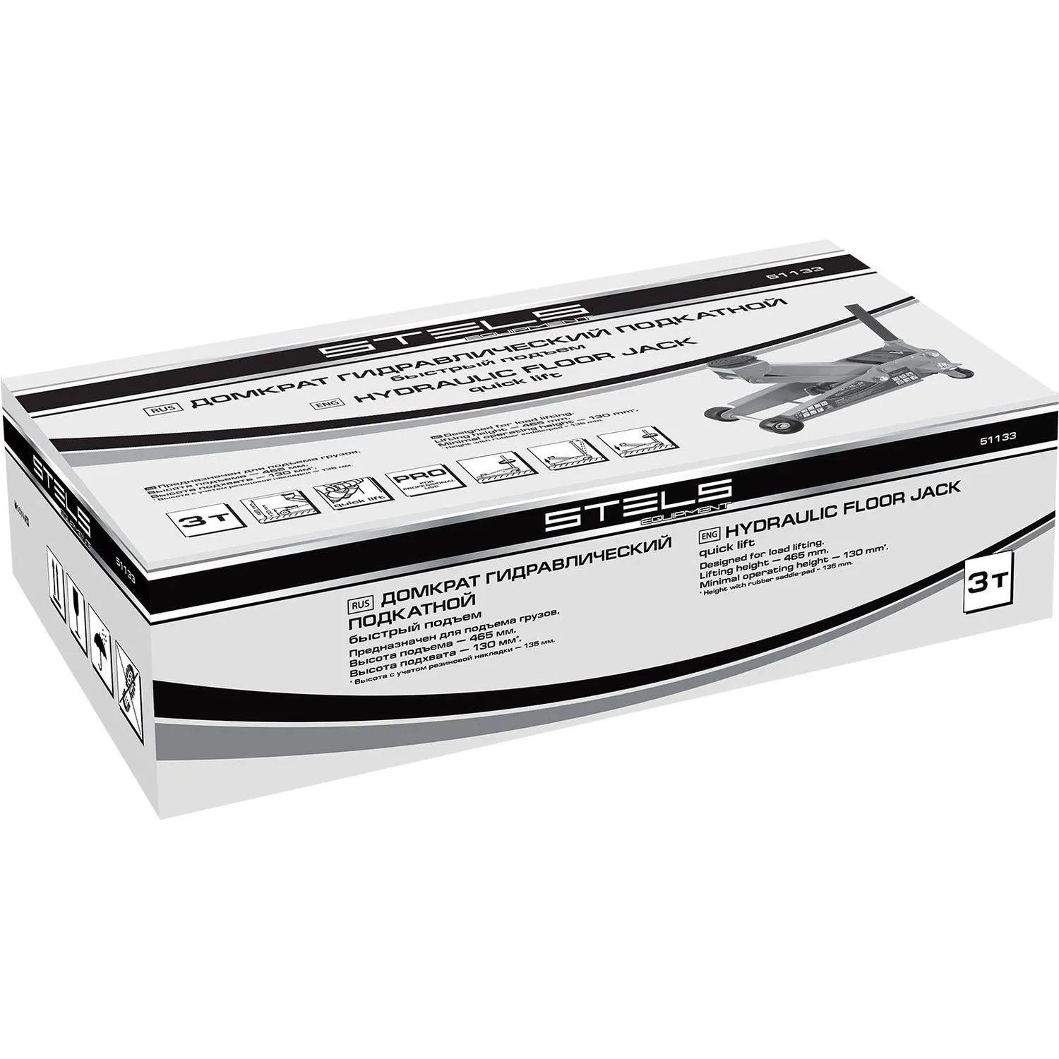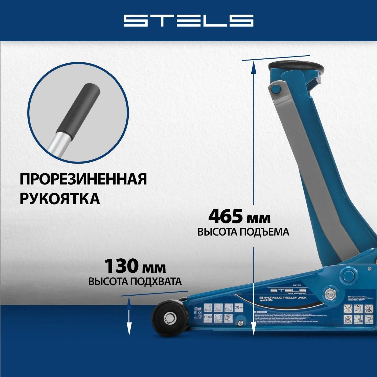 Домкрат гидравлический подкатной Stels 3 тонн 130-465 мм (51133)<br><br>Профессиональный подкатной гидравлический домкрат Stels QUICK LIFT 51133 используется для быстрого подъёма на высоту 130-465 мм всех типов автомобилей со стандартным клиренсом и массой до 3 тонн. Благодаря системе QUICK LIFT для достижения предельной высоты достаточно 7 качков рукоятки. Домкрат подходит для использования на станциях техобслуживания и шиномонтажа.<br><br>Преимущества<br>— Аккуратная работа — резиновая опора и прорезиненная ручка защищают кузов автомобиля и корпус домкрата от повреждений.<br>— Надёжная конструкция — карданная передача обеспечивает долговечность домкрата, двухплунжерный насос сохраняет работоспособность даже при выходе из строя одного из плунжеров — домкрат будет работать за счёт второго.<br>— Защита от перегрузок — предохранительный клапан не позволяет поднимать грузы тяжелее 3 тонн.<br>— Долговечность — хромированные штоки и резиновые сальники устойчивы к износу.<br>— Дополнительные возможности — в специальный лоток для мелких деталей можно сложить болты и гайки.<br>— Подтверждённое качество — домкрат прошёл тестирование с 25%-м превышением допустимой нагрузки.<br><br>Внешний вид и/или характеристики товара могут быть изменены производителем в соответствии с производственным процессом.