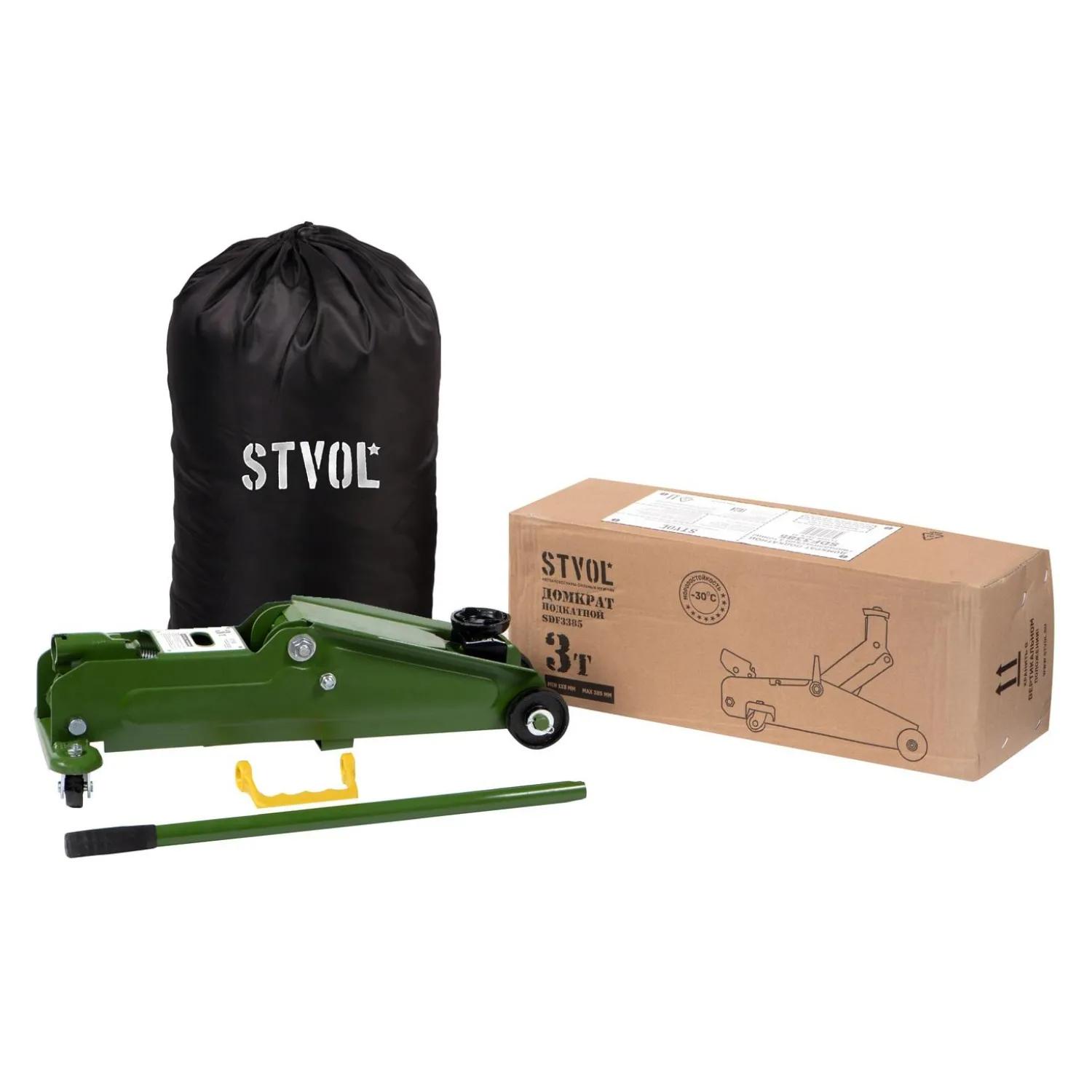 Домкрат гидравлический подкатной Stvol 3 тонны, 133 мм (SDF3385)<br><br>Данная модель является незаменимым инструментом при работе в автосервисе, при ремонте автомобиля, используется при <nobr>ремонтно-строительных</nobr> работах. . Благодаря использованию морозостойкого масла, домкрат прекрасно справляется со своими функция при низких температурных режимах.<br>Максимальная грузоподъемность: 3 т;<br>Высота подъема: 385 мм;<br>Высота подхвата: 133 мм;<br>Особенности: <br>Клапан безопасности;<br>Рукоятка для переноски;<br>В комплект поставки входит:<br>Кейс для хранения и транспортировки;<br>Домкрат;<br>Упаковочная коробка;<br><br>Домкрат не предназначен для длительного удерживания автомобиля на весу! Запрещено производить работы под автомобилем до установки страховочных подставок!<br><br><!--noindex-->Внешний вид и/или характеристики товара могут быть изменены производителем в соответствии с производственным процессом.<!--/noindex-->