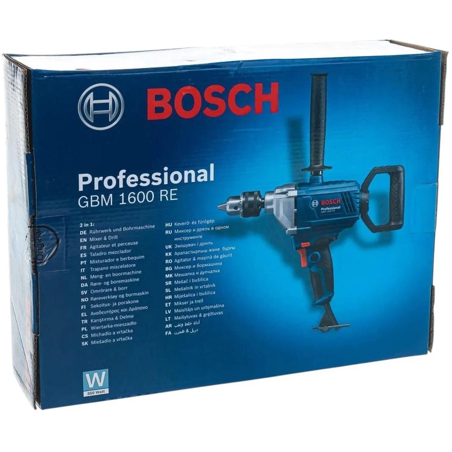 Дрель-миксер Bosch GBM 1600 RE<br><br>Дрель безударная Bosch GBM 1600 RE — профессиональный инструмент для проделывания отверстий в различных материалах: древесине, керамике, пластмассе. Помимо этого, можно замешивать порошкообразные массы, например, строительный клей. Сочетания этих 2 функций позволяет эффективно выполнять различные задачи, не переплачивая за дополнительный инструмент.<br><br>Комплектация<br>• Дрель;<br>• Дополнительная рукоятка;<br>• Кулачковый патрон 16 мм;<br>• Ключ для патрона;<br>• Упаковка.<br><br>Внешний вид и/или характеристики товара могут быть изменены производителем в соответствии с производственным процессом.